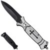Vystřelovací nůž s ostrou čepelí z nerezové oceli, pevným klipem do kapsy, hrotem na sklo a pojistkou proti otevření. Tělo nože je také z nerezové oceli a jednu stranu zdobí plastová střenka s křížem.