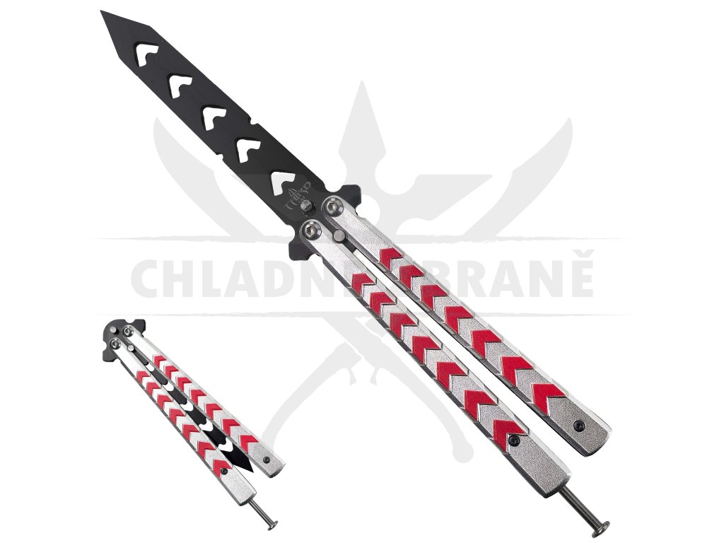 Stříbrný motýlek "ARROWS RED", se vyznačuje nejen výkonem, ale také svým stylovým a futuristickým designem. S celkovou délkou 23,5 cm je tento balisong nožem, který překračuje očekávání ve své cenové kategorii.