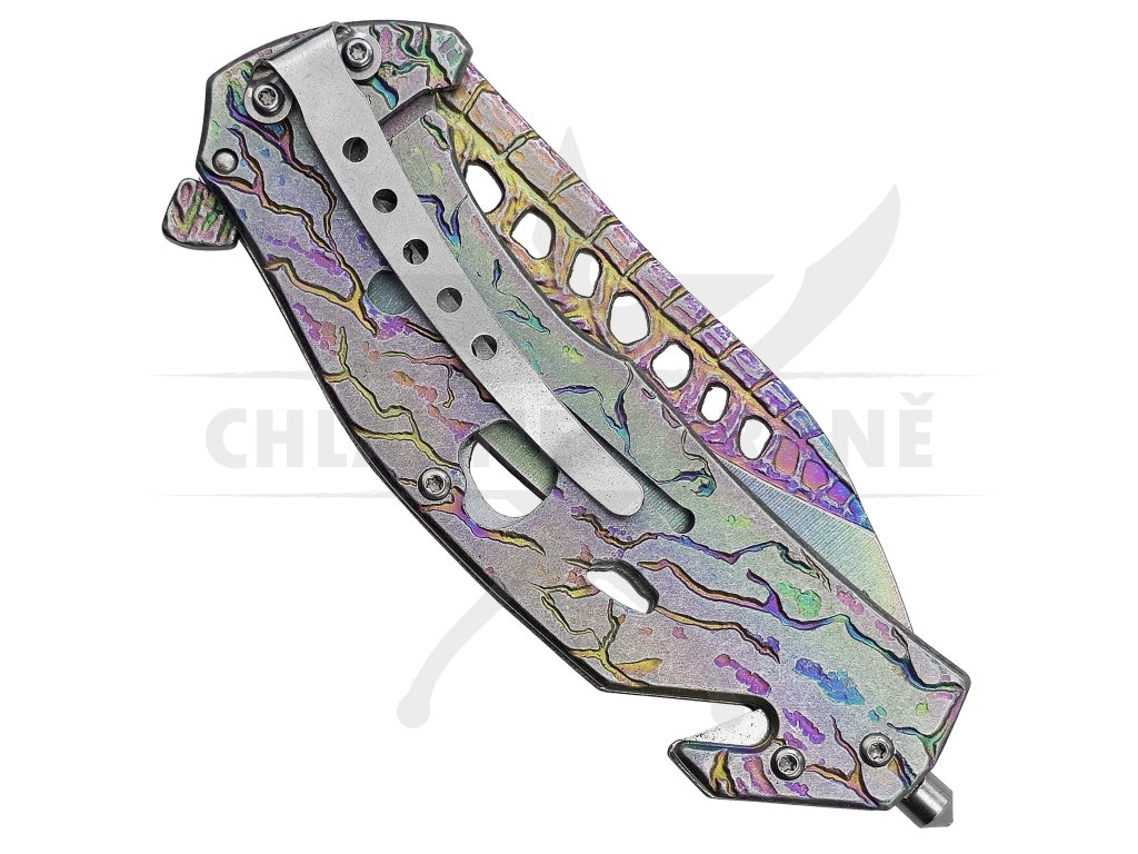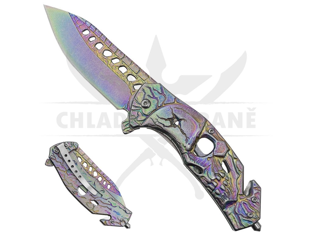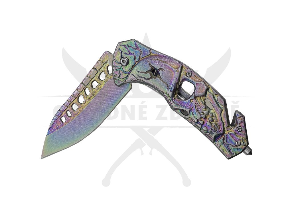 SKULLSHOT je výrazný zavírací nůž, který zaujme na první pohled – ať už svým agresivním designem s 3D lebkou, nebo duhovým povrchem celé konstrukce. Celokovové tělo z nerezové oceli včetně čepele a střenek zajišťuje vysokou odolnost a pevnost. Nůž je vybaven framelock pojistkou, která pevně fixuje čepel při práci, a praktickým kapesním klipem pro nošení.