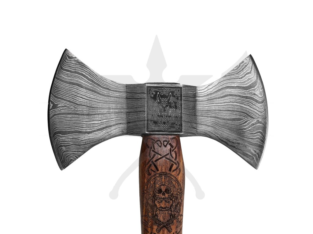 Damašková sekera „HEL GARM“ představuje spojení tradičního severského umění a moderního zpracování. Její oboustranná hlavice je vyrobena z překládané damaškové oceli, která vyniká krásnou texturou a odolností. Obě ostří jsou jemně vybroušená, vhodná pro lehčí práci nebo jako dekorativní prvek. V centru hlavice se nachází detailní laserové gravírování norského vlka, symbolu odvahy, věrnosti a síly.