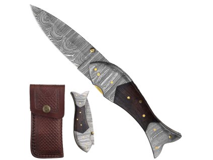 Luxusní zavírací nůž ve tvaru rybičky s čepelí i rukojetí z překládané oceli a střenkami z rosewoodu. Součástí je kožené pouzdro s možností nošení na opasku.