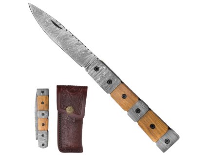 Zavírací damaškový nůž s unikátní segmentovou rukojetí z olivového dřeva a překládané oceli. Ruční zpracování, čepel z překládané oceli, kožené pouzdro s poutkem.
