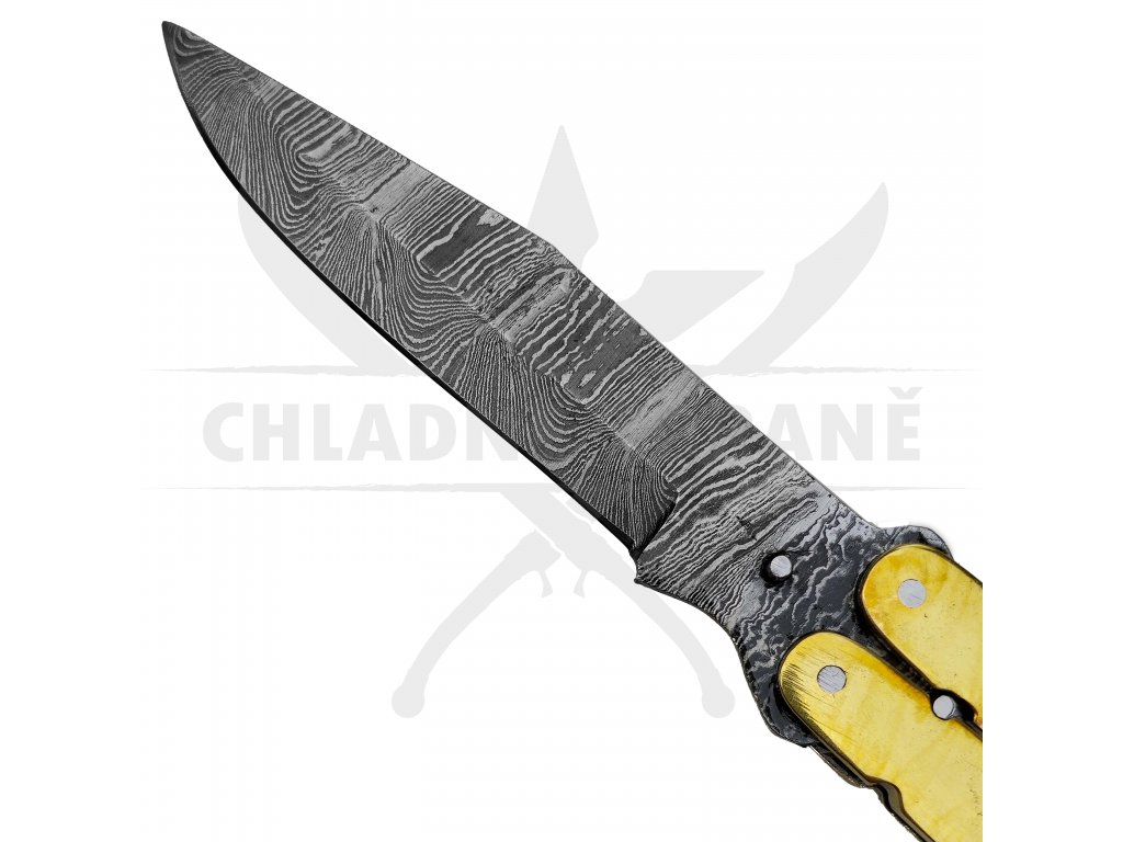 Čepel tohoto motýlku je vyrobena z moderní damaškové oceli, která je známá svou vysoce kvalitní strukturou a vynikající odolností vůči opotřebení. Díky svému damaškovému vzoru na čepele je každý motýlek unikátní a má své vlastní umělecké vyznění. Čepel motýlku měří 8,7 cm a již z výroby je ostřena.