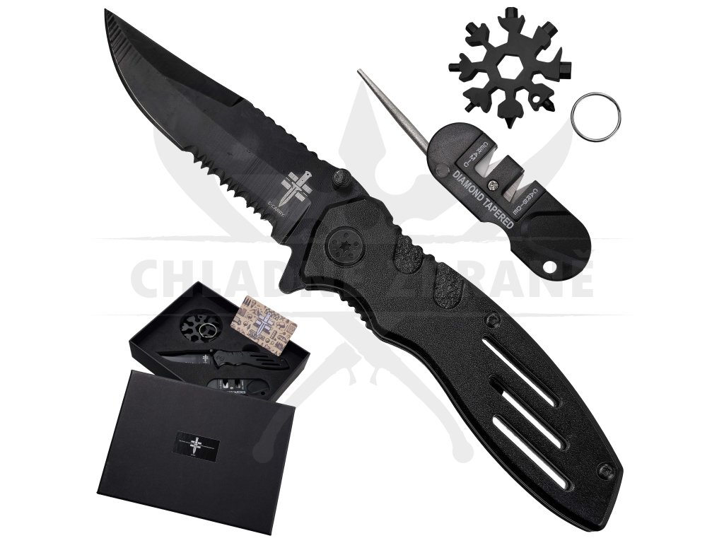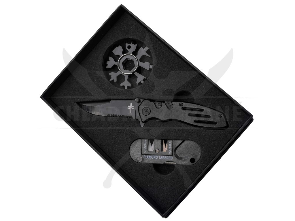 Dárková sada, která je skvělou volbou pro všechny, kdo chtějí praktický a zároveň elegantní set na každý den i do přírody. Obsahuje lehký zavírací nůž s kombinovaným ostřím, multifunkční sněhovou vločku (multi-šroubovák) a kapesní brousek na nože. Celý set je uložen v stylové černé krabičce, která z něj dělá i ideální dárek.