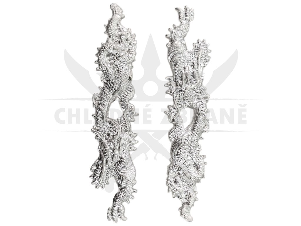 Obě varianty se liší především motivem – černá verze působí více mýtickým, ostře řezaným dojmem, zatímco stříbrná verze nabízí robustní moderní vzhled s bohatým dračím reliéfem. Každá sada je lehká, nádherně zpracovaná a připravená k použití nebo vystavení.