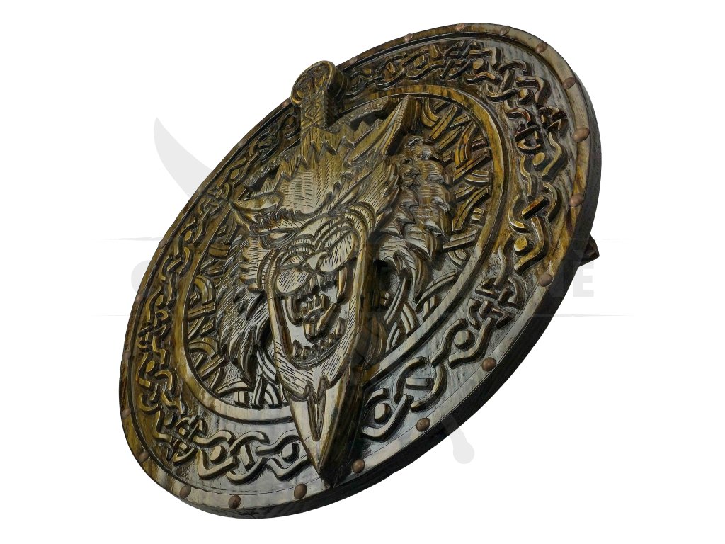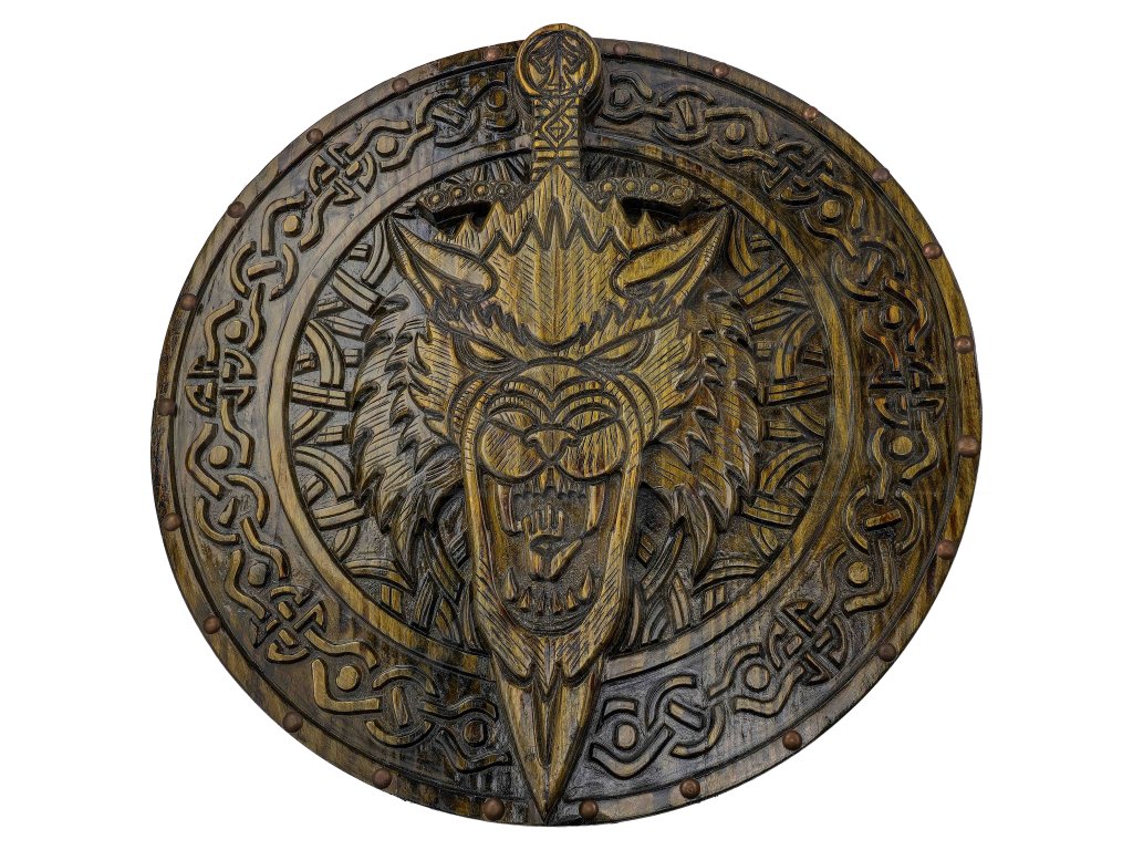 Dřevěný štít „SAVAGE FENRIR“ zaujme na první pohled výrazným reliéfem vlčí hlavy zasazeným do ornamentálního kruhu inspirovaného severskou symbolikou. Výrazné zdobení a kontrastní ruční malba vytváří dominantní vizuální prvek, který vynikne jak při reenactmentu, tak jako dekorace do interiéru, klubovny či zbrojnice. Průměr 60 cm odpovídá klasickému kulatému štítu používanému v raném středověku.