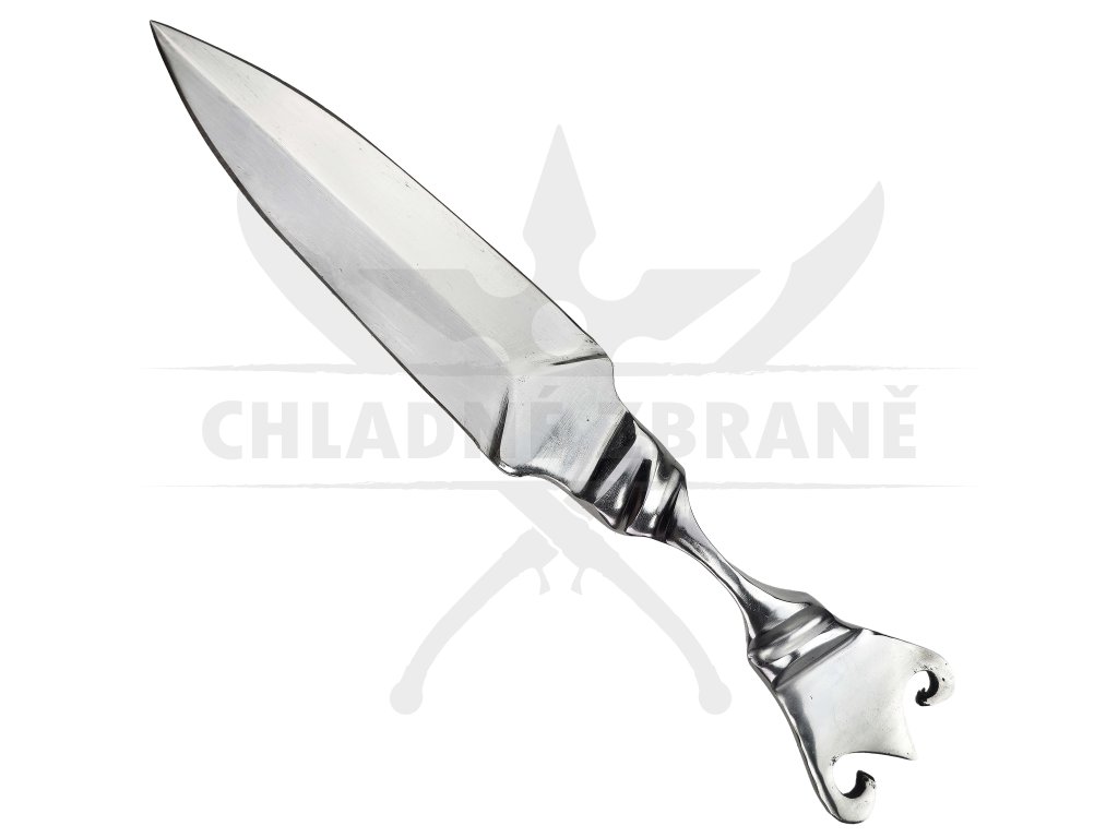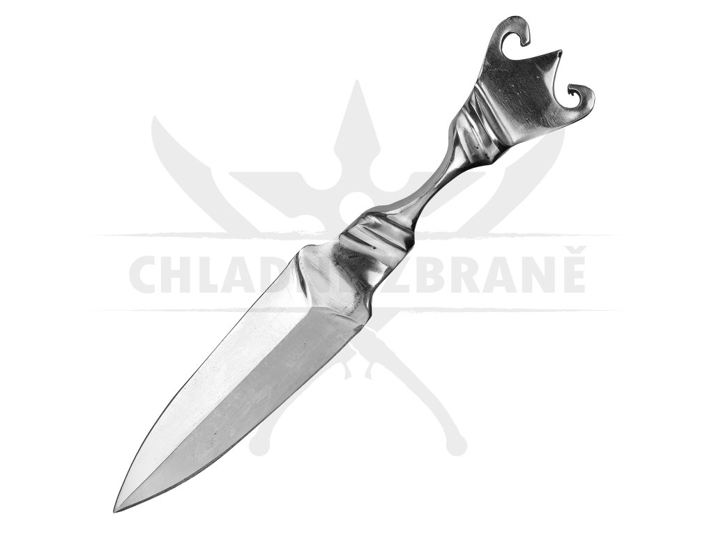 Bezešvá rukojeť navazuje plynule na čepel a tvoří s ní kompaktní a stylový celek. Zakončení rukojeti zdobené esovitými výřezy působí jako artefakt z jiného světa – jako zbraň temného elfa nebo stínového asasína.