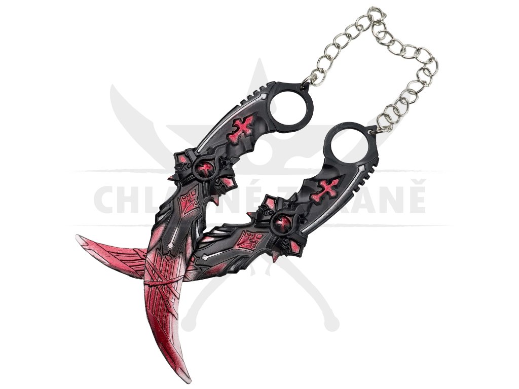 Jedinečný fantasy přívěsek, který přináší do světa šperků pořádnou dávku temné elegance a herního stylu. Design inspirovaný tvarem karambitů vypadá jako zbraně vytažené přímo z fantasy světa. Obě čepele jsou spojeny kovovým řetízkem, což dodává přívěsku neobvyklý a poutavý vzhled, který zaujme na první pohled.