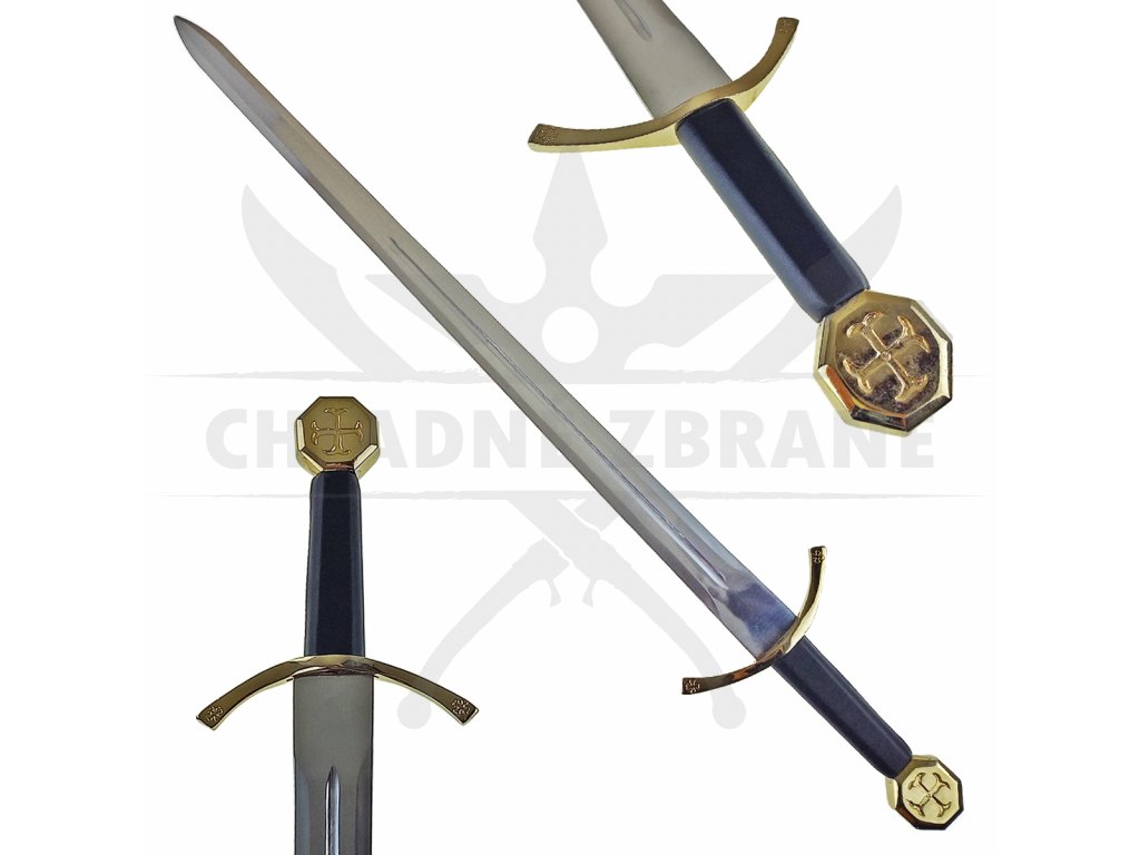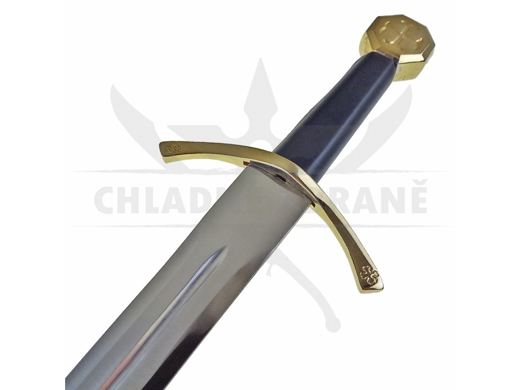 Hlavice meče je pak ve tvaru mince s rytinou symboliky kříže a je vyrobená z masivního kusu mosazi.