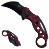 Karambit z nerezové oceli, vyvedený v červené barvě. Tvarovaná rukojeť z odolného plastu. Součástí karambitu je plastové pouzdro s tkaninou.