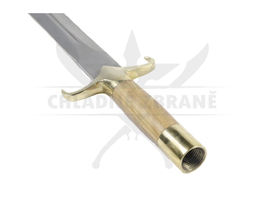Tato záštita pak přechází v rukojeť vyrobenou z olivového dřeva.