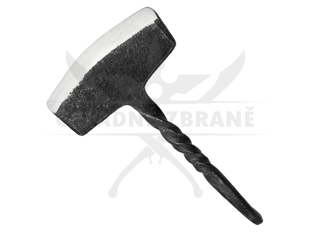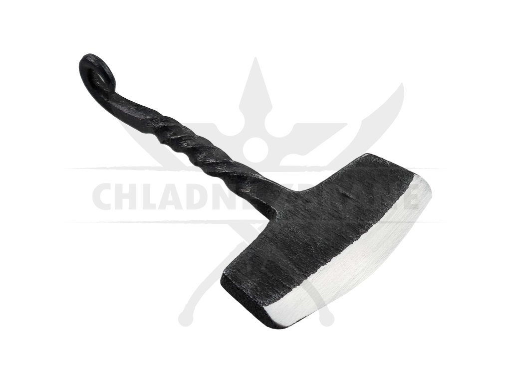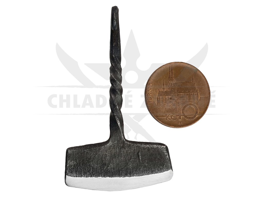 Každý kus je individuálně kovaný z uhlíkové oceli, s charakteristickým zvráceným topůrkem a kontrastním leštěným ostřím (přívěsek není plně ostrý – bezpečný pro nošení jako dekorativní amulet). Povrch si zachovává autentickou strukturu kovu, což mu dodává drsný vikingský vzhled.