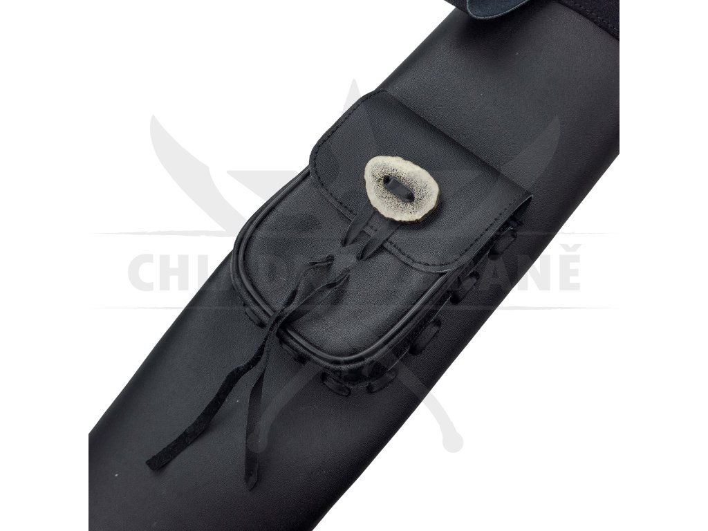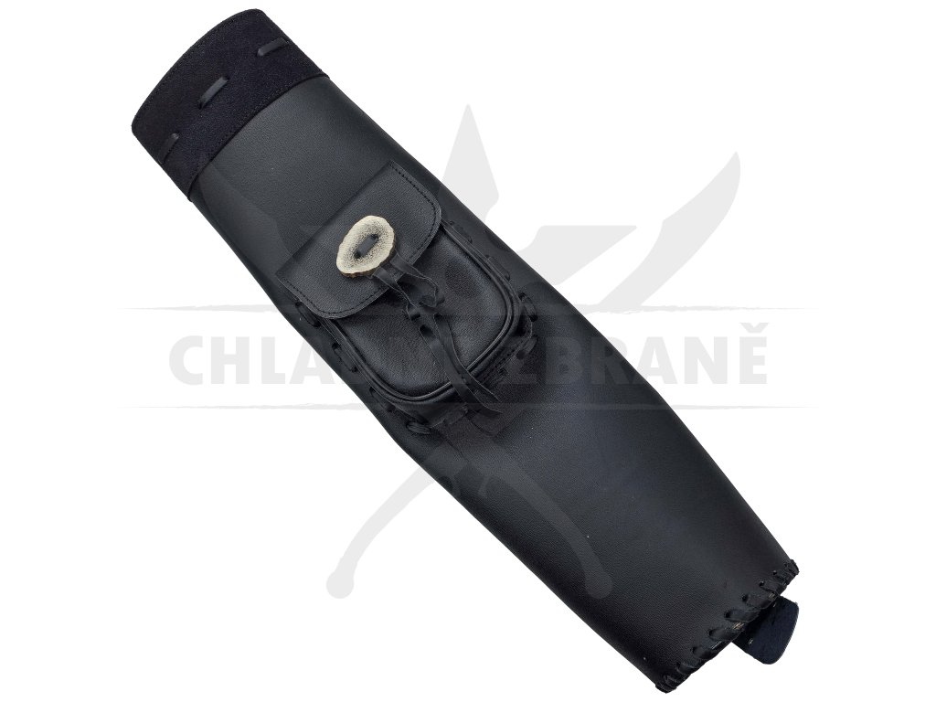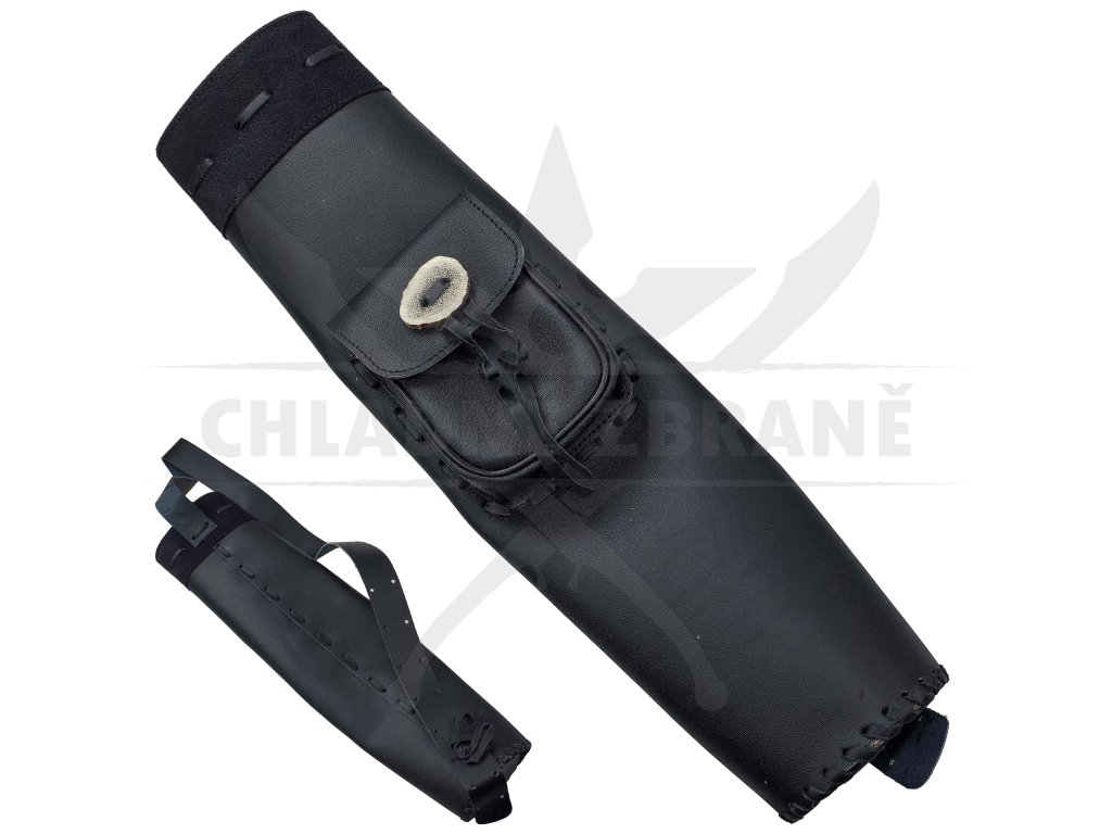 Součástí je nastavitelný kožený popruh, díky kterému lze toulec nosit klasicky na zádech i pohodlně za pasem. Na přední straně se nachází praktická kapsa se zavazováním a ozdobným kouskem parohu, do které lze uložit drobnosti, jako je tětiva, vosk nebo multitool.