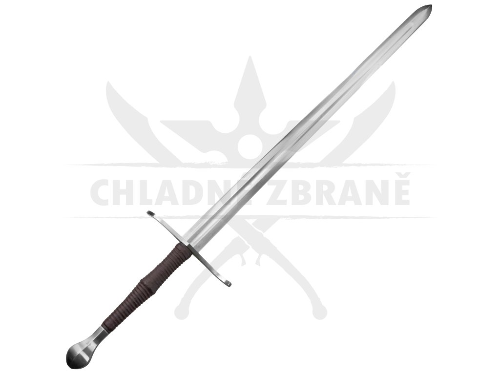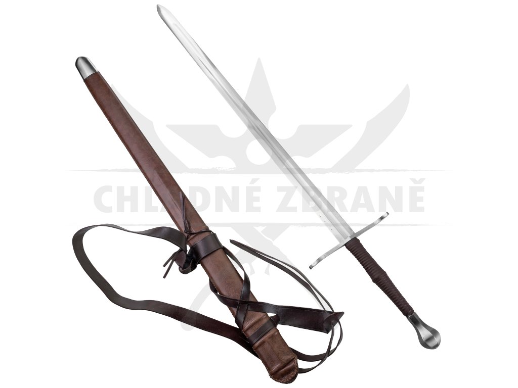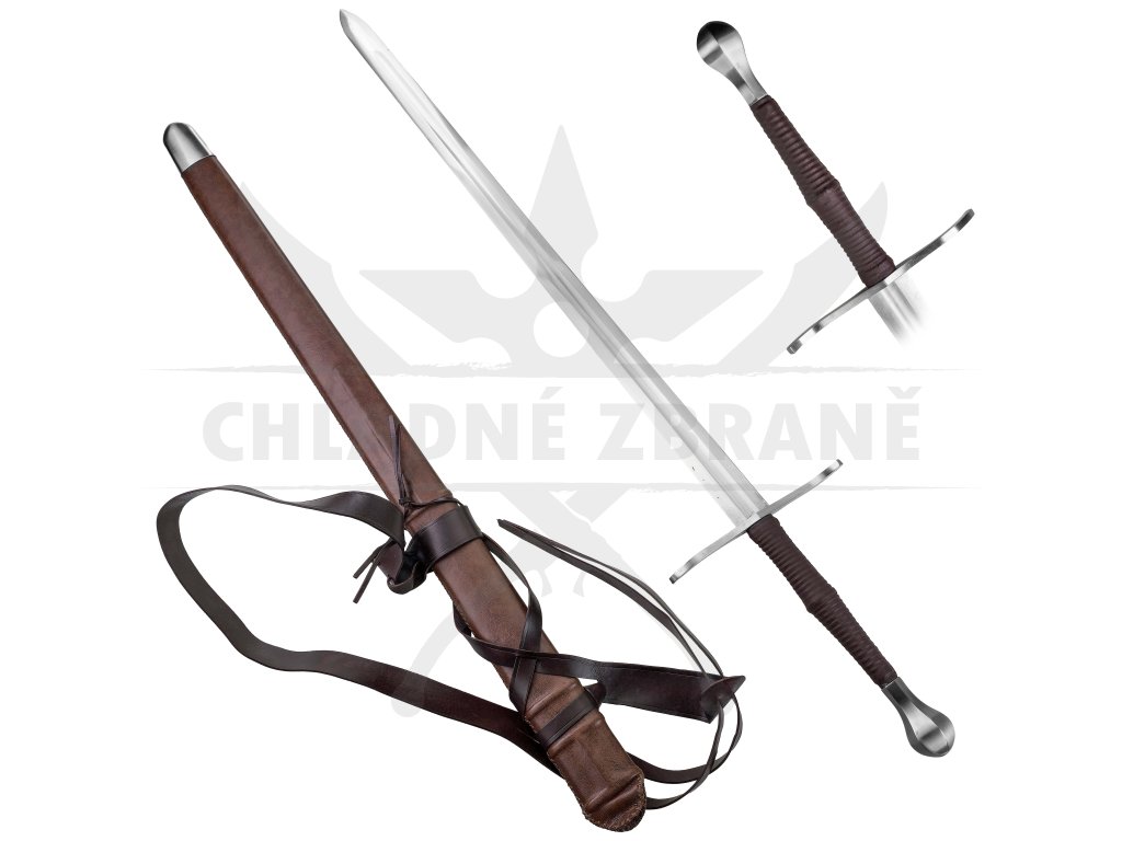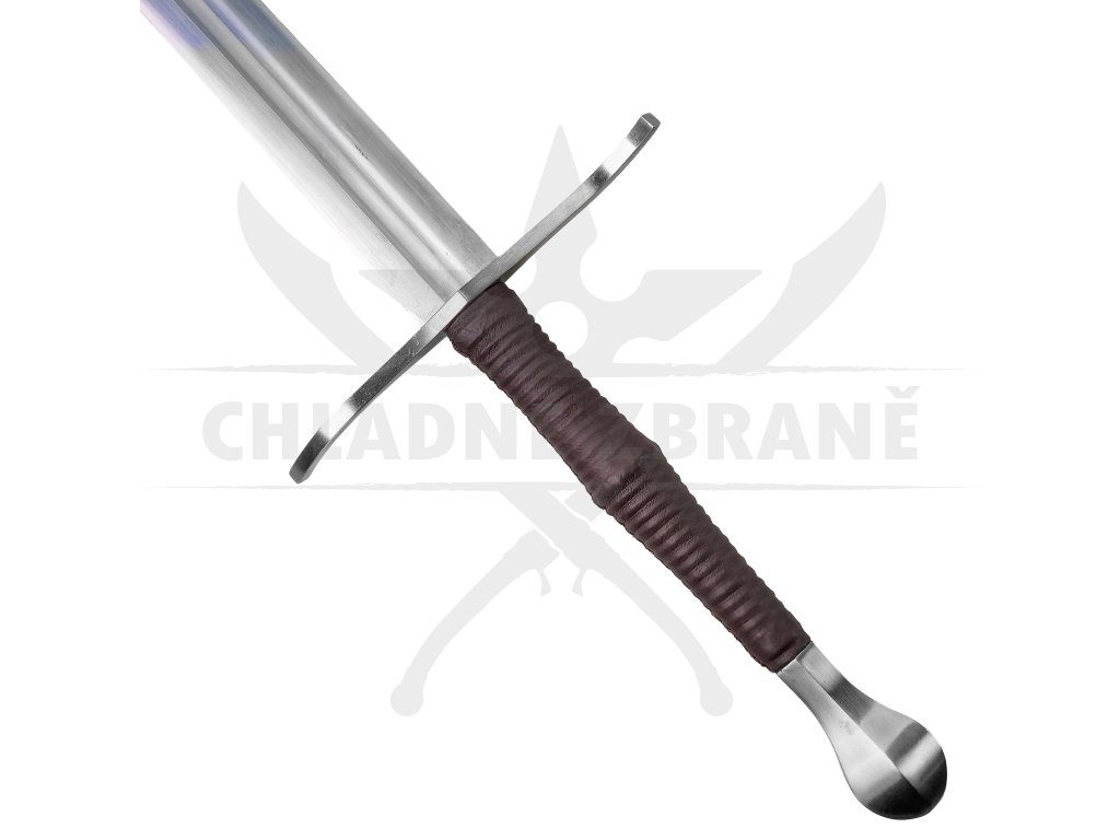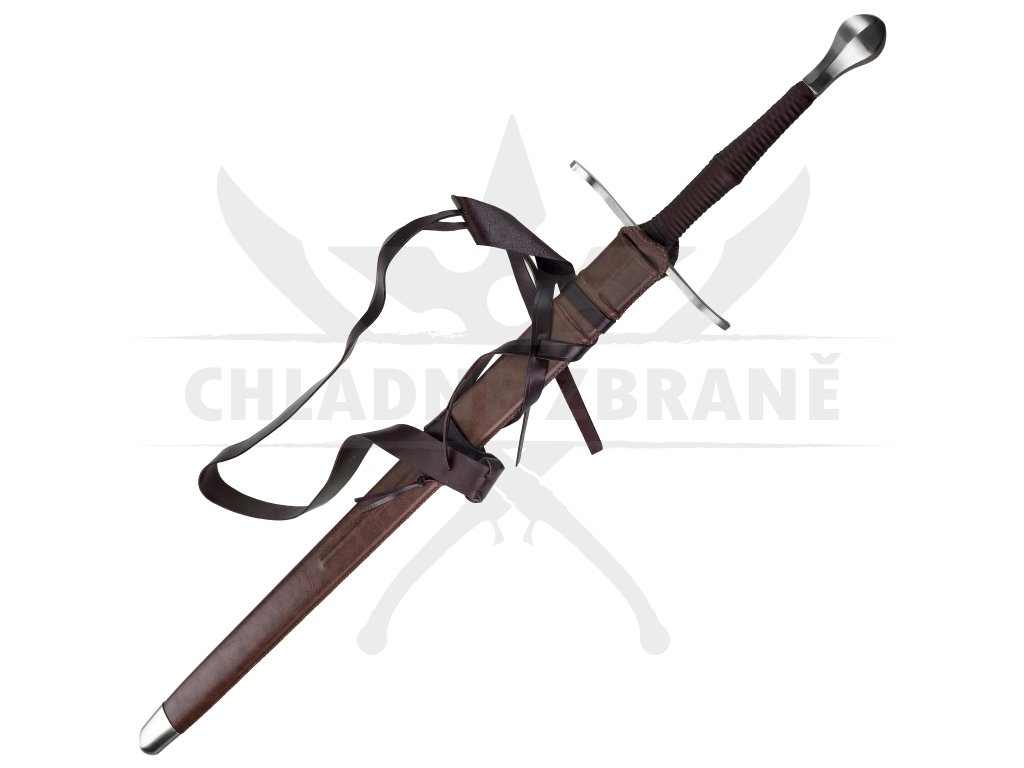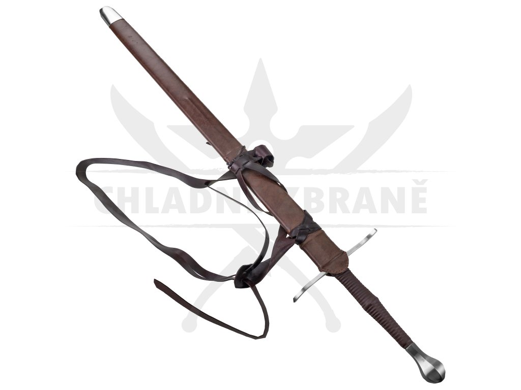 Obyčejná kroutivá kovová záštita a hruškovitá hlavice zajišťují vynikající vyvážení meče. Rukojeť je potažena pravou kůží pro pevný a pohodlný úchop i při delším používání. Součástí balení je dřevěná pochva potažená pravou kůží, doplněná o popruh umožňující nošení přes rameno nebo na opasku – funkční a elegantní doplněk v jednom.