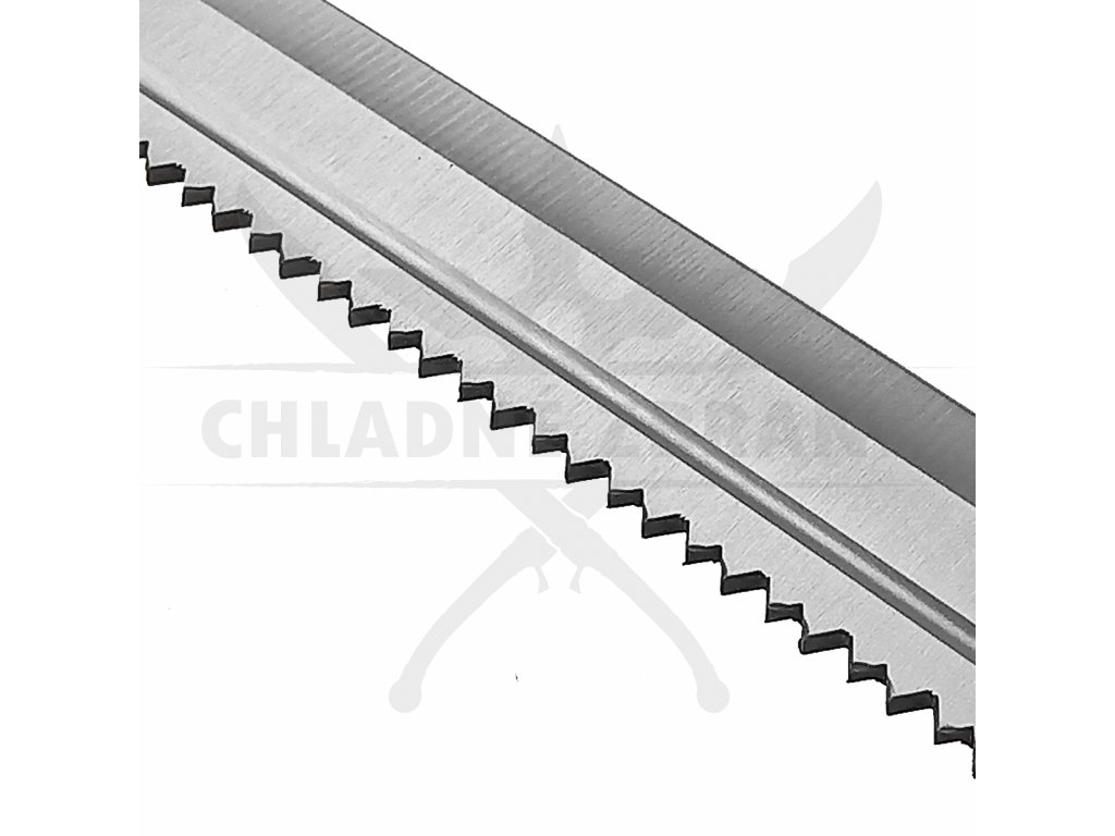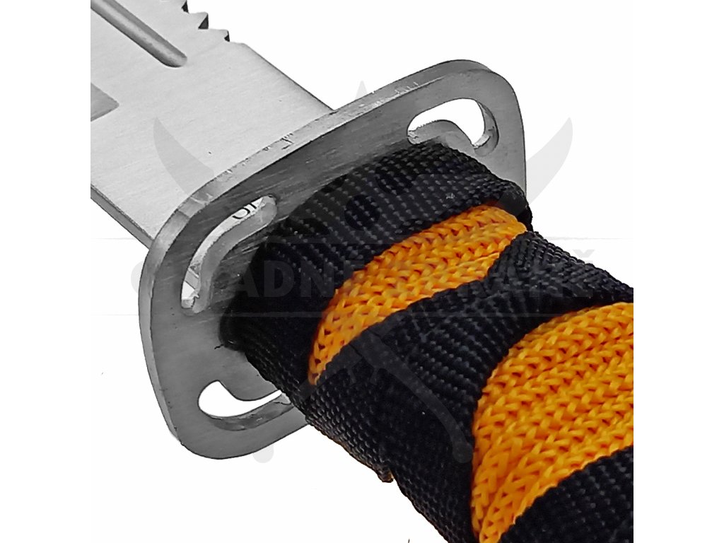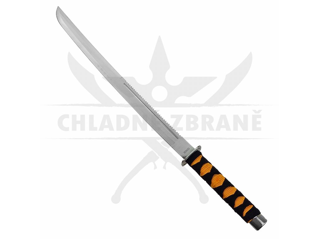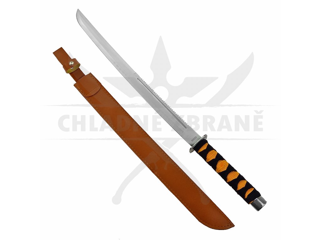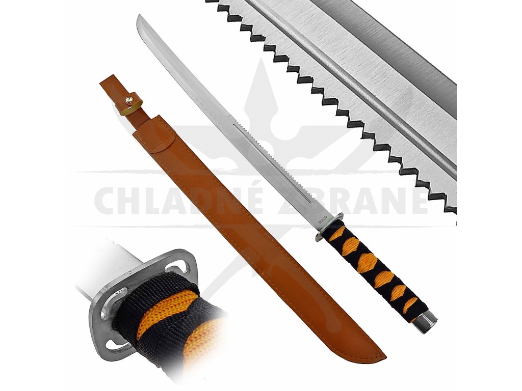 Katana/mačeta "MODERN SAMURAI" měří optimálních 70 cm, což je velmi slušná délka na mačetu, zbraň je však o poznání skladnější než klasická katana a snáze se s ní manipuluje. Čepel je vyhotovena z nerezové oceli a na vrchu disponuje pilkou pro široké využití. Rukojeť díky klasickému opletu saje pot, pohodlně se drží, má tu správnou délku a navíc pěkně vypadá! Katana/mačeta má praktickou záštitu pro ochranu prstů.