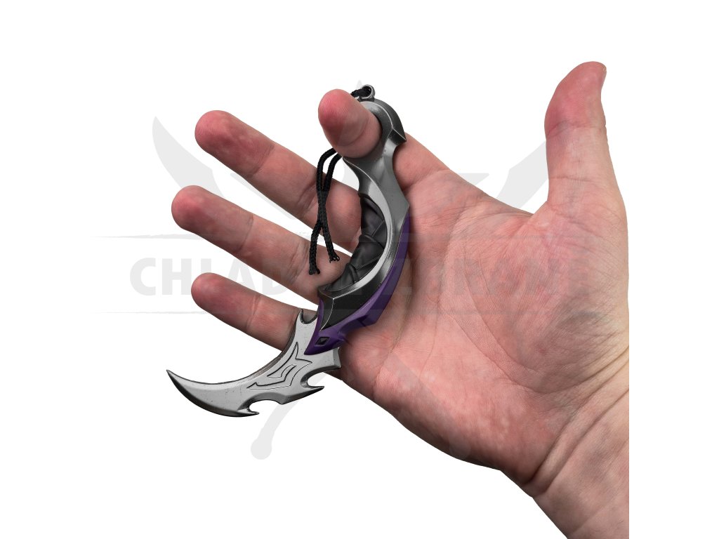 Přenes se do světa Valorantu s věrnou replikou legendárního Reaver Karambitu, ikonické zbraně oblíbené především mezi fanoušky temnějších skinů. Tento karambit vyniká agresivním, elegantně zahnutým designem, který kombinuje temné kovové tóny s typickými fialovými akcenty – přesně jako ve hře.