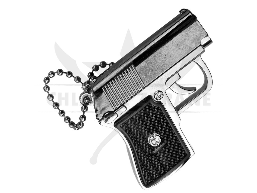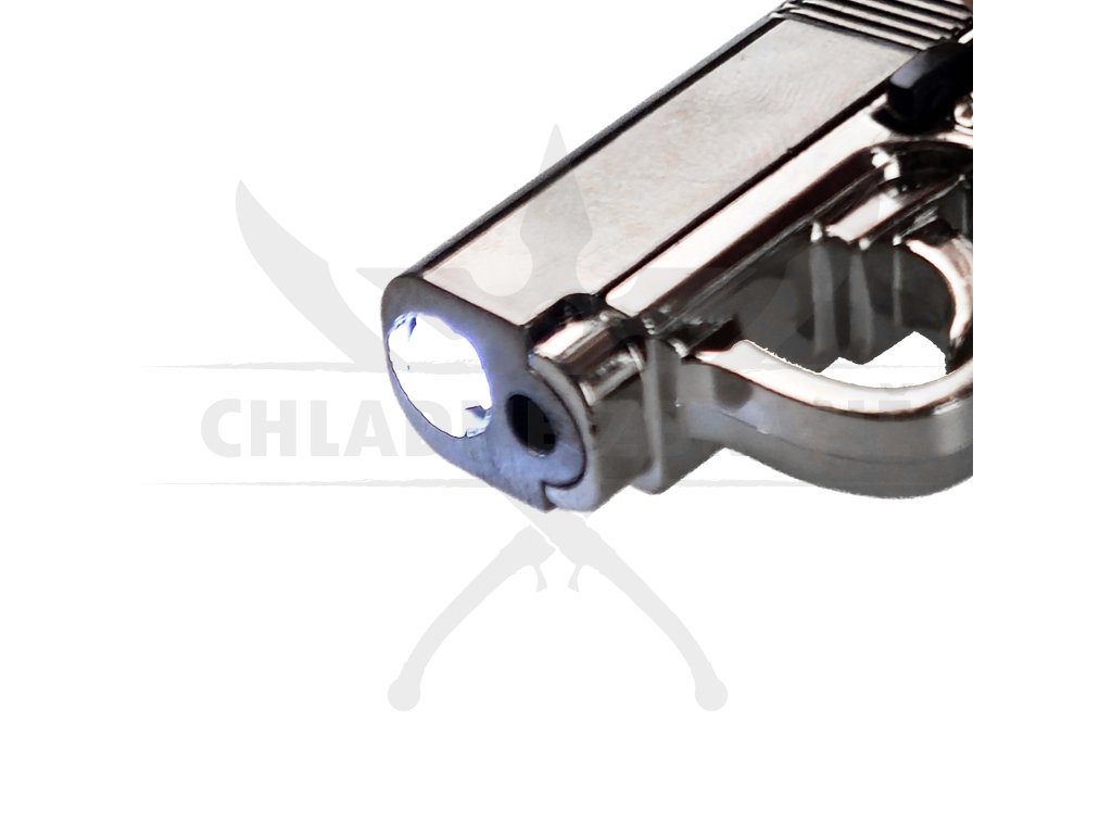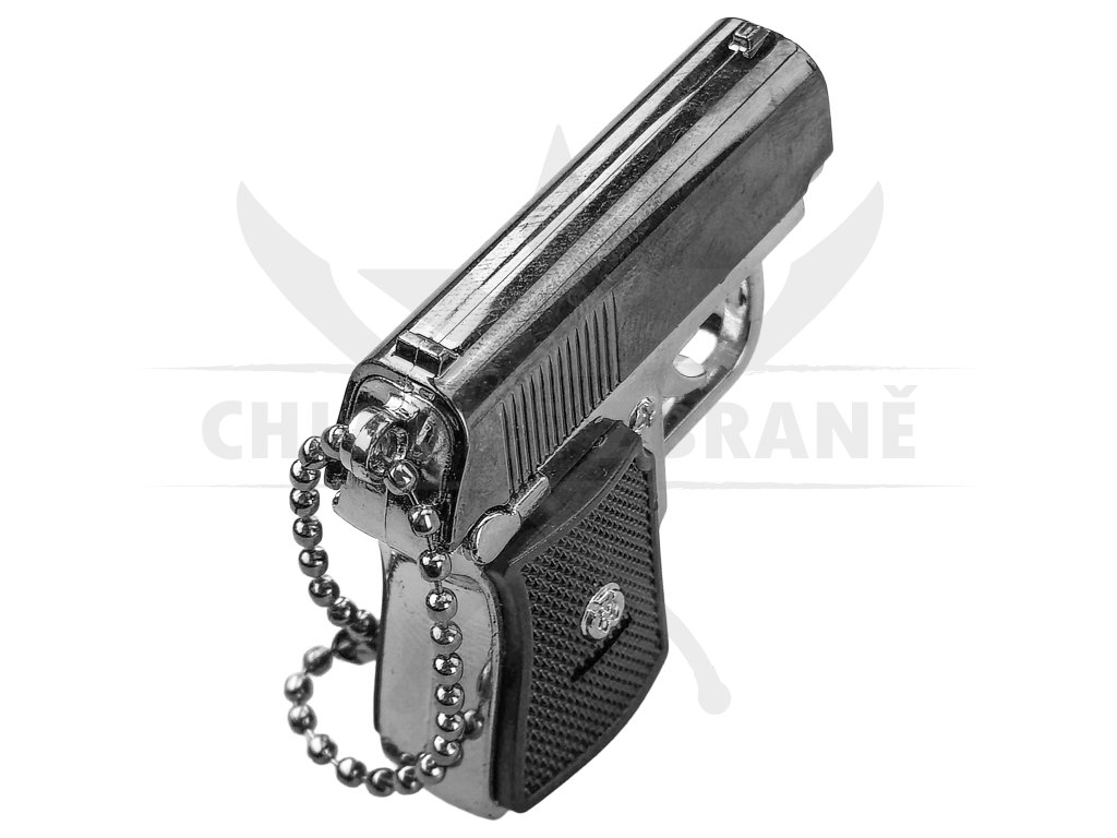 Tělo je vyrobeno z lehkého ABS plastu s lesklou kovovou povrchovou úpravou, která mu dodává realistický vzhled miniaturní zbraně. Díky svým rozměrům (pouhých 4,2 cm) se pohodlně vejde na klíče, batoh nebo opasek. Na konci je připevněn kovový řetízek, takže můžete mít tento drobný gadget neustále u sebe.