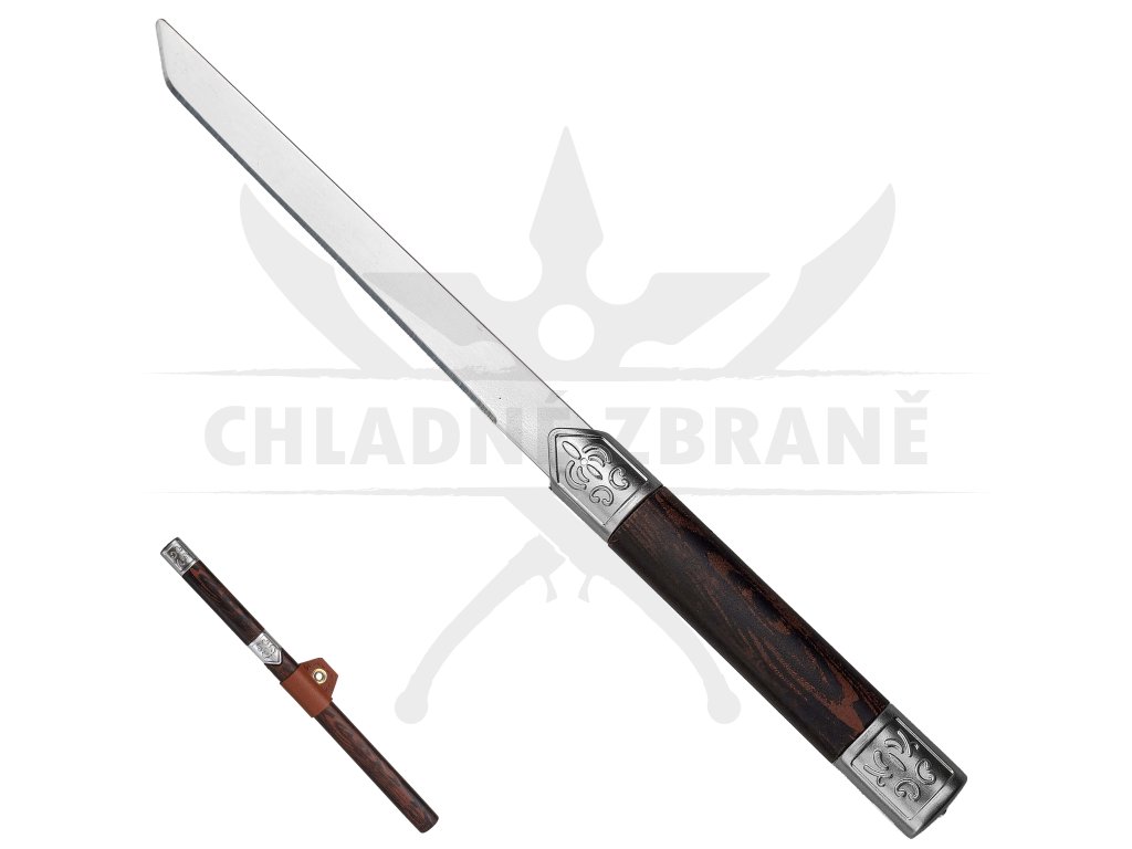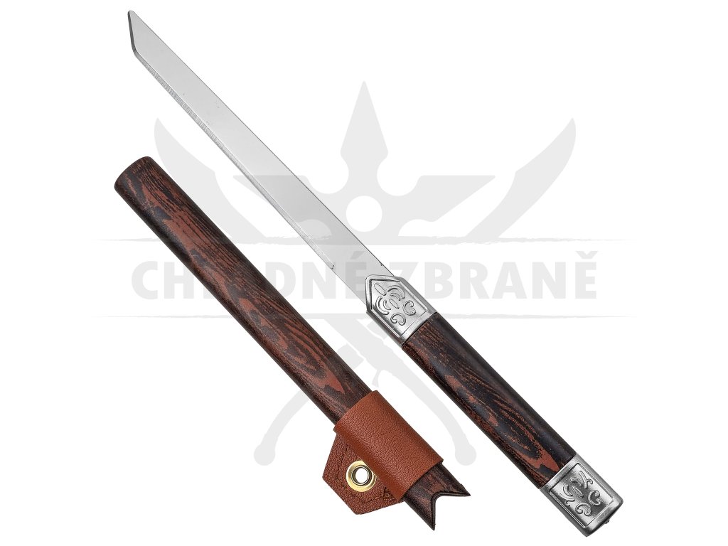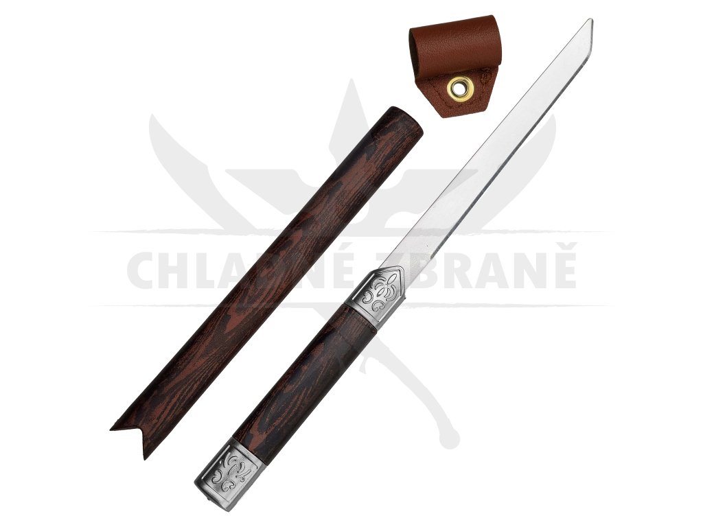 Čepel z kvalitní nerezové oceli o délce 11 cm je jemně ostrá a zakončená typickým tanto hrotem, který dodává noži výrazný charakter. Rukojeť i pochva jsou vyrobeny v dekoru tmavého dřeva a doplněny kovovými prvky se zdobnými motivy. Pochva je navíc vybavena poutkem pro snadné zavěšení.