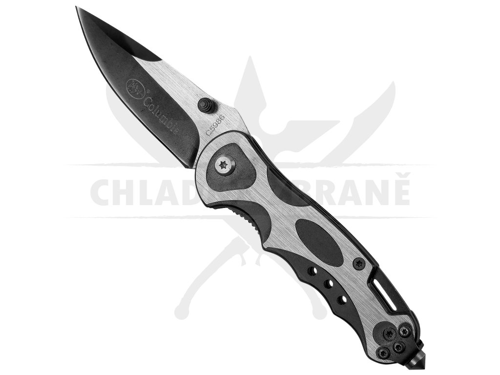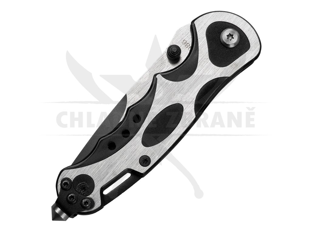 Rukojeť je ergonomicky tvarovaná, dobře padne do ruky a díky kombinaci oceli a černých vložek působí moderně a robustně. Na jejím konci se nachází záchranný hrot pro rozbití skla – praktický doplněk pro krizové situace. O bezpečné používání se stará linerlock pojistka, která brání samovolnému zavření nože.