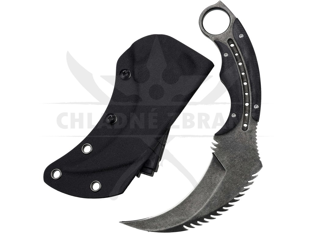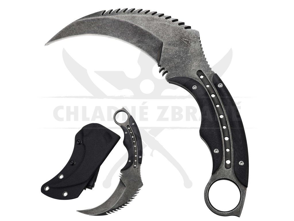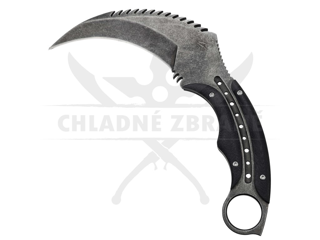 Karambit, jenž je nekompromisní volbou pro ty, kdo hledají masivní, spolehlivý a výborně zpracovaný nástroj pro EDC i outdoor využití. Tento full-tang model je vyroben z odolné oceli D2, která nabízí skvělou tvrdost, odolnost proti opotřebení a dlouhodobé držení ostří. Výrazně zakřivená čepel s ozubenou horní hranou poskytuje maximální účinnost při řezu a bojových aplikacích.