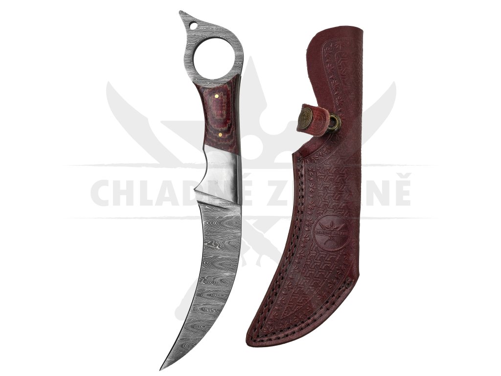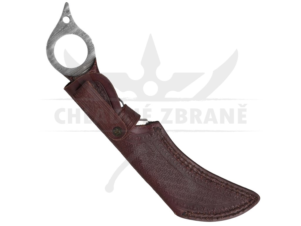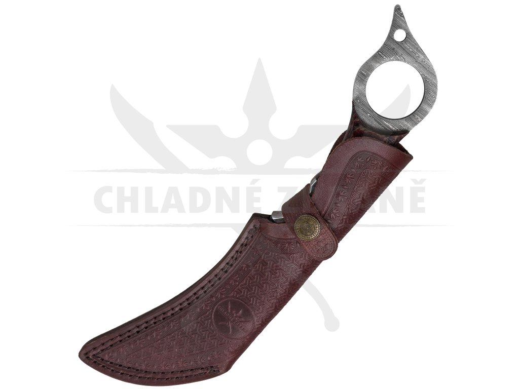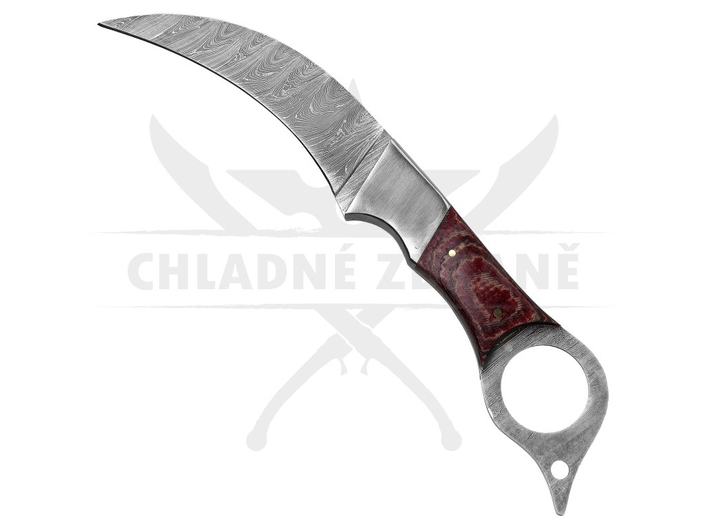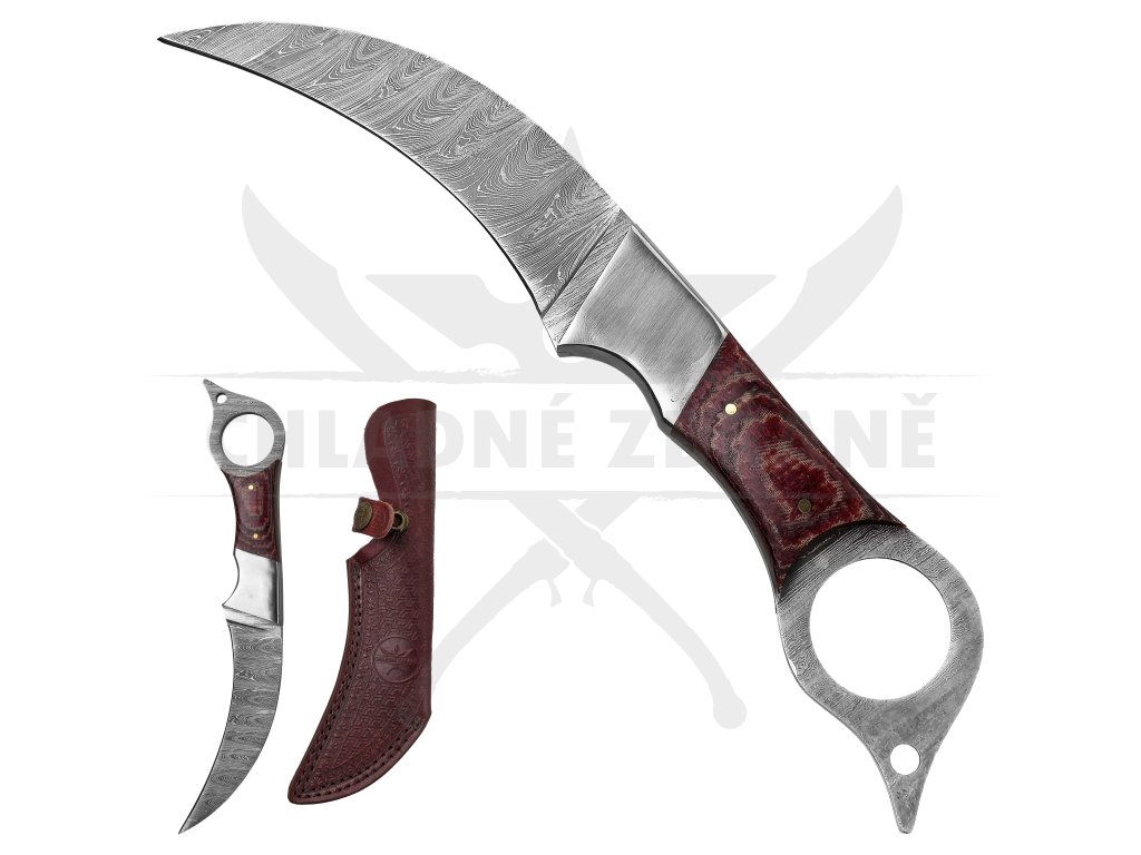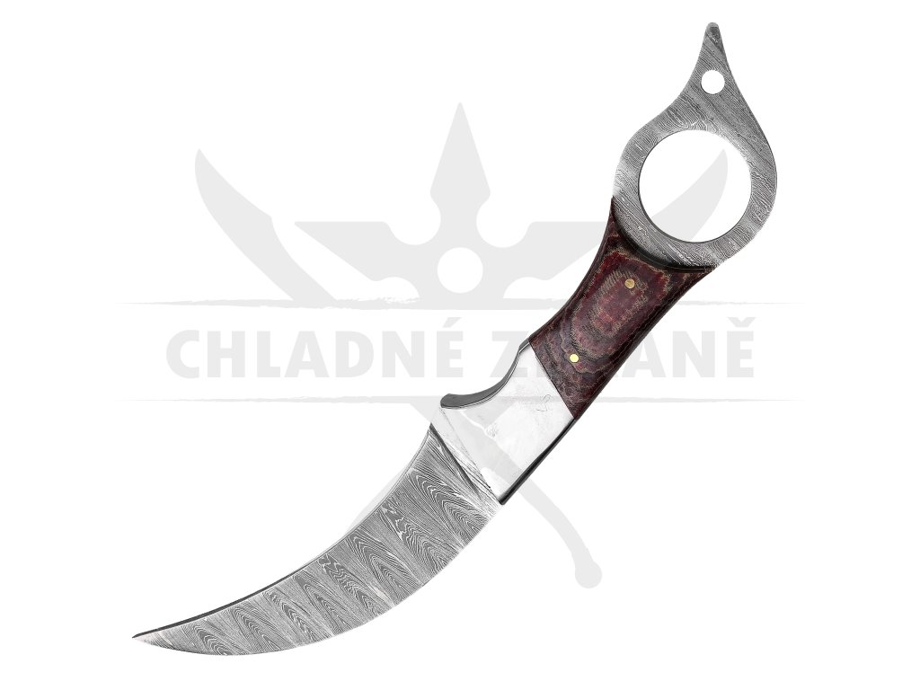 Tento masivní karambit je navržen jako HQ nástroj pro ty, kdo hledají kombinaci těžké konstrukce a výrazného designu. Čepel z překládané (damaškové) oceli zaujme jemnou vlnitou kresbou a robustním profilem — díky tomu nůž působí i pracuje jako skutečně odolný kus výstroje. Celkový dojem doplňuje výrazný kroužek pro prst a ergonomická rukojeť s vložkou z micarty, která zajišťuje pevný úchop i při náročném použití.