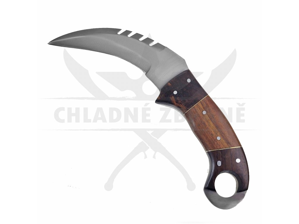 Rukojeť Karambitu je obložena morušovým dřevem, které nejen dodává noži elegantní vzhled, ale také zvyšuje pohodlí a pevný úchop. Dřevěné obložení je precizně upravené a dotváří celkový design nože.