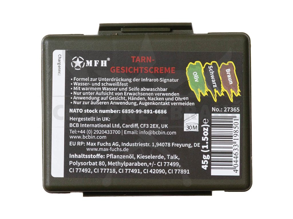 Kamuflážní barva BCB značky MFH v praktické krabičce se zrcátkem je ideálním pomocníkem pro maskování během vojenských, taktických či outdoorových aktivit. Kombinace hnědé, černé a zelené barvy umožňuje splynout s přírodním prostředím v lese, na poli nebo v městské zástavbě. Barva se aplikuje na obličej, krk, ruce i uši – vždy se však vyhýbejte kontaktu s očima!