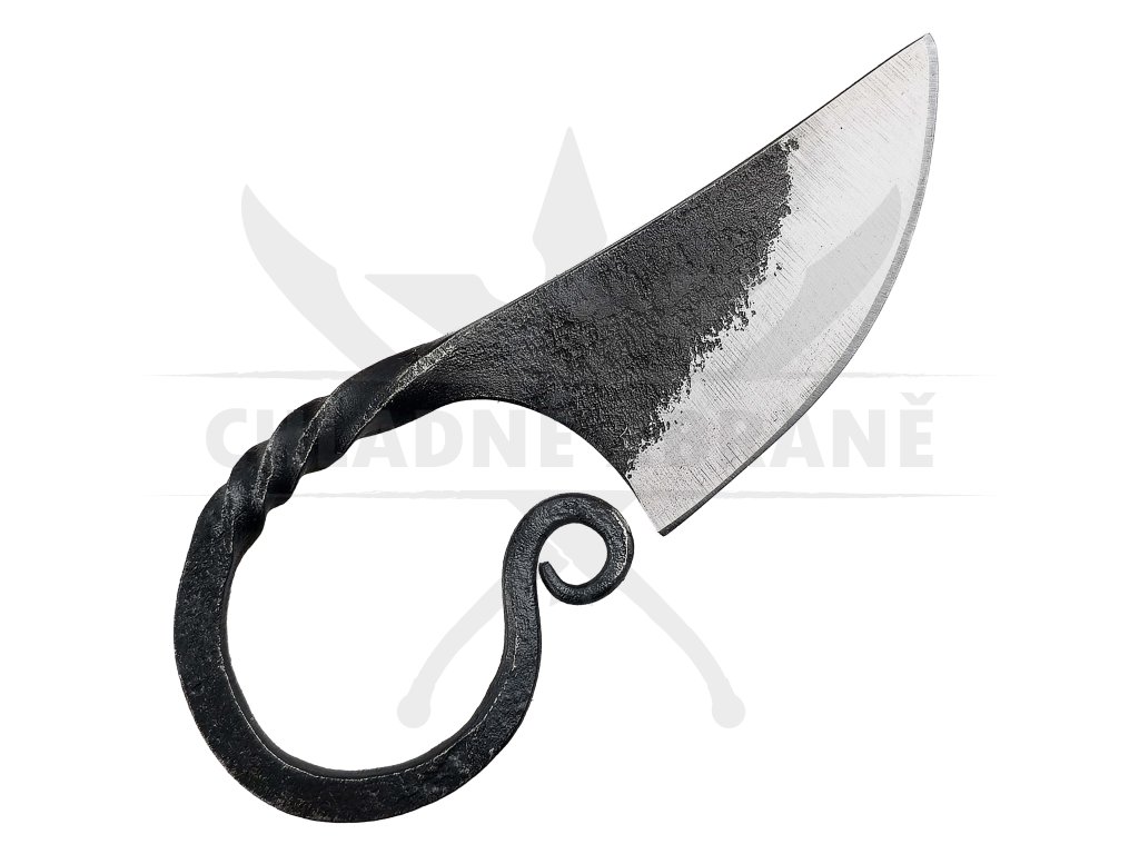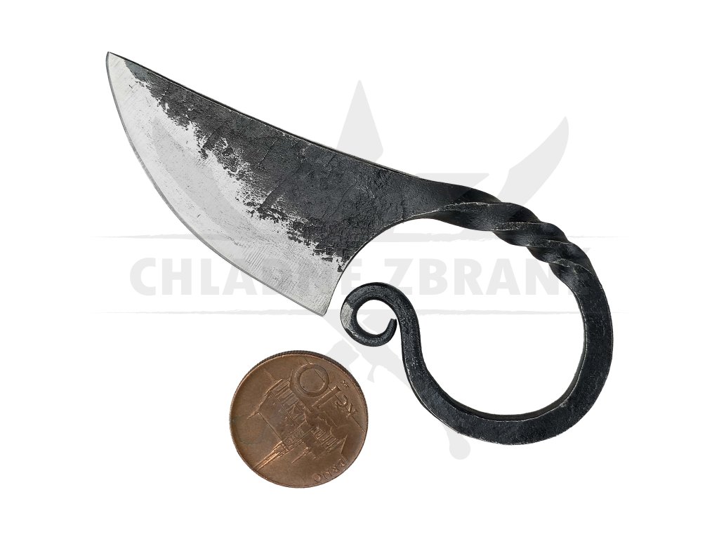 Čepel je vykována z jednoho kusu oceli s výraznou texturou povrchu a zakončena elegantně zakroucenou rukojetí, typickou pro keltský styl. I přes své kompaktní rozměry je nůž pevný, odolný a díky svému tvaru překvapivě dobře padne do ruky.