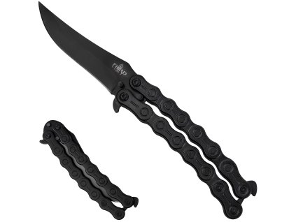 Ostrý balisong s čepelí z nerezové oceli 420, s povrchovou černou úpravou. Rukojeti připomínající řetěz jsou také vyrobené z nerezové oceli.