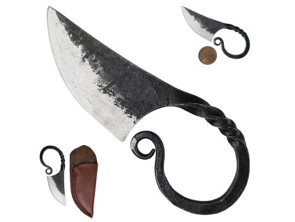 Miniaturní ručně kovaný keltský nůž s dekorativní zakroucenou rukojetí a koženým pouzdrem. Autentický doplněk pro sběratele a milovníky historických replik.