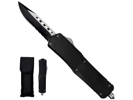 Čelně vystřelovací kapesní nůž s ostrou čepelí z nerezové oceli 3Cr13. Bytelná rukojeť hrotem na sklo a klipem na opasek, nylonové pouzdro součást balení.