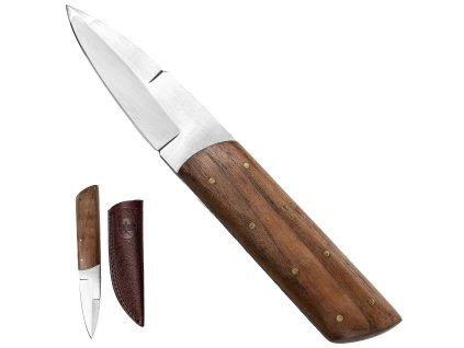 Odolný pevný nůž s full-tang ocelí D2 s rukojetí z ořechového dřeva a koženým pouzdrem. Klasický bushcraft design, jednostranné ostří a jistý úchop pro práci v přírodě.
