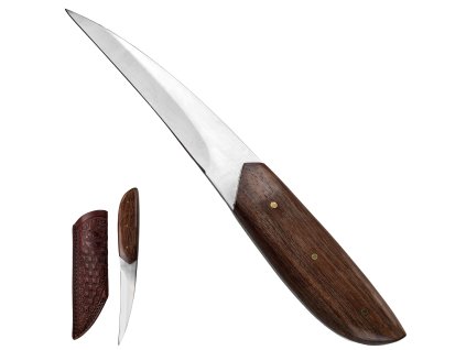 Odolný pevný nůž z oceli D2 s elegantní rosewood rukojetí a koženým pouzdrem. Zakřivená čepel pro precizní řezy a robustní konstrukce pro náročné použití.
