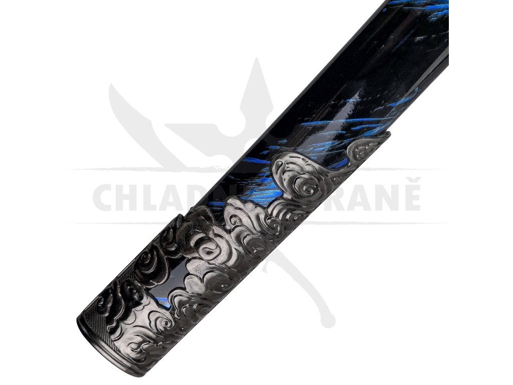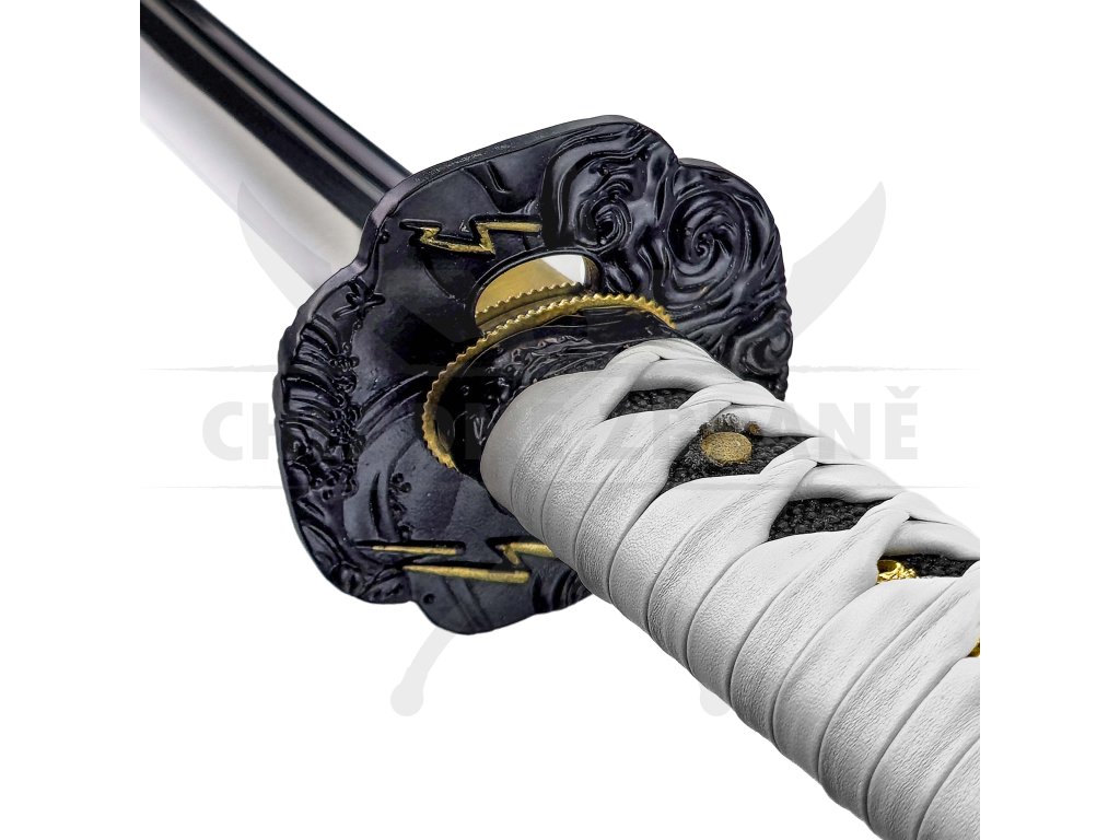 Čepel je vyrobena z uhlíkové oceli, není ostřená, ale je precizně leštěná. Rukojeť (tsuka) je dřevěná, obtočená tradiční bílou tkaninou (ito) s černými ozdobami samegawa. Kovová záštita tsuba je bohatě zdobená motivy blesků a větru, zatímco pochva saya je doplněna kovovým zakončením a pevným modrým sageo – šňůrou pro uchycení k obi (pásu). Každý detail byl vytvořen s důrazem na kvalitu a filmovou estetiku.