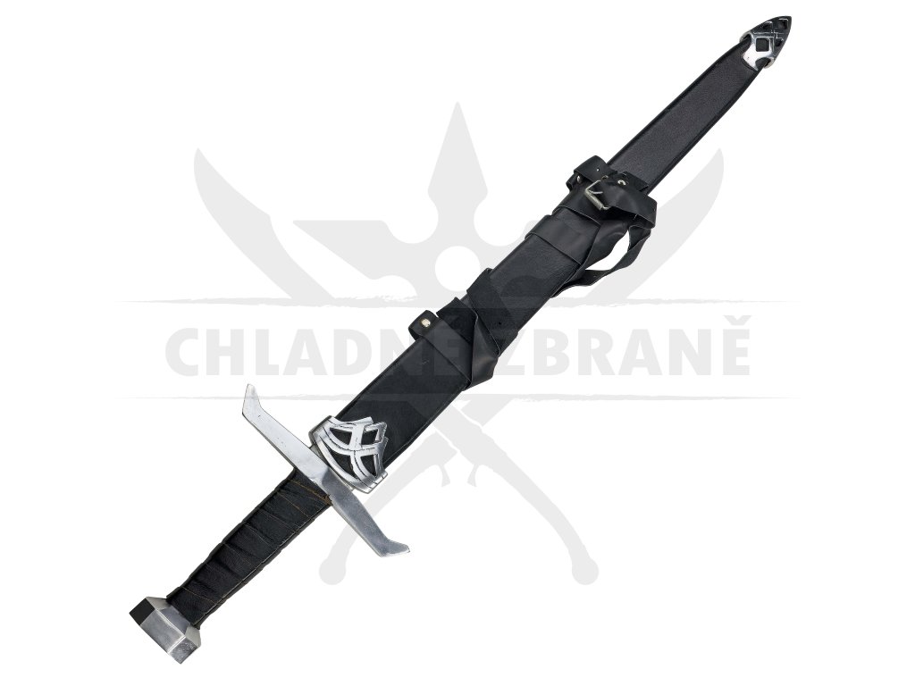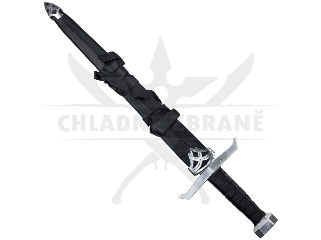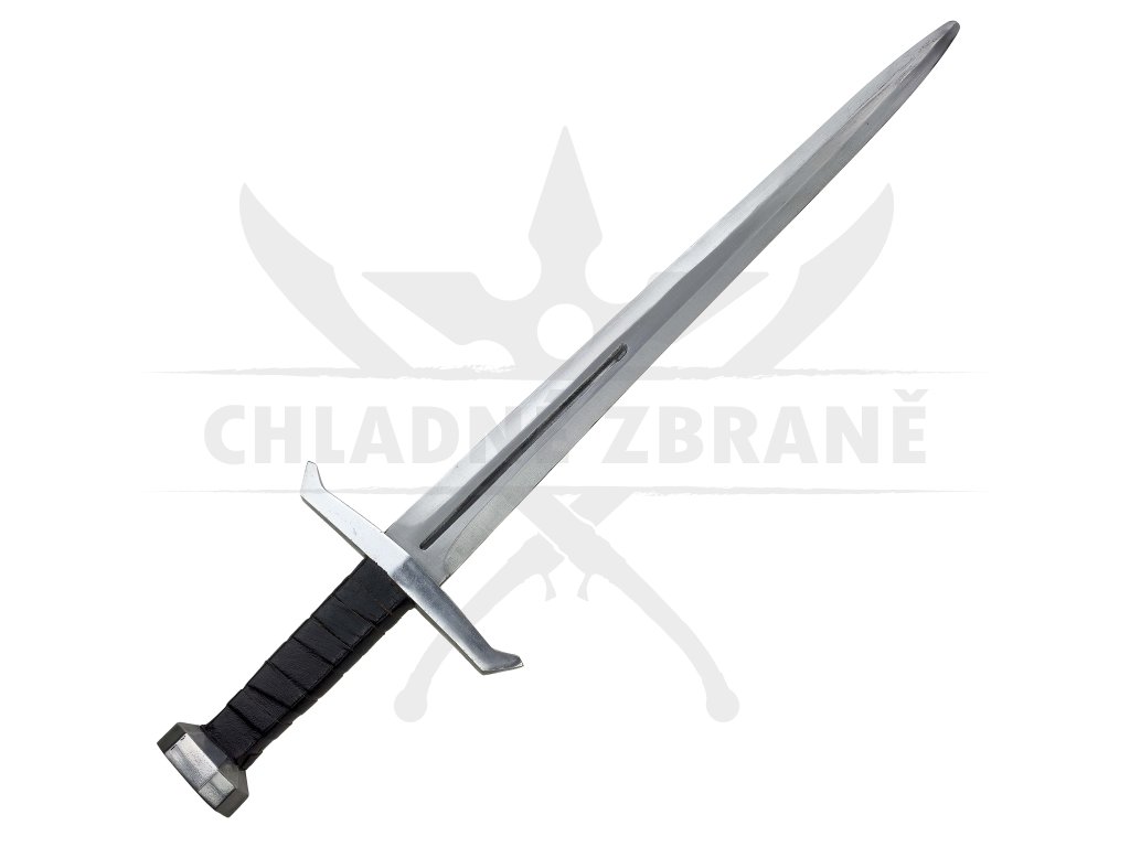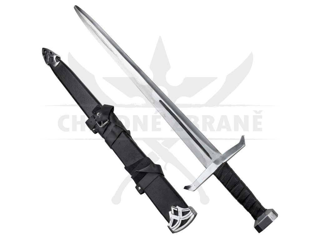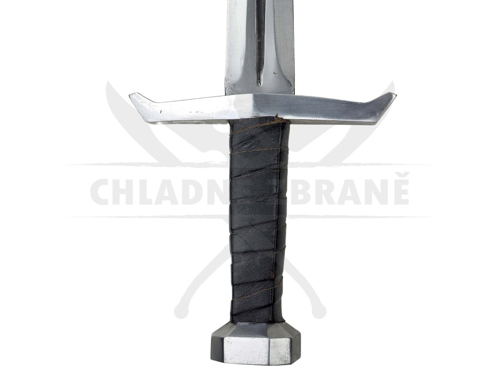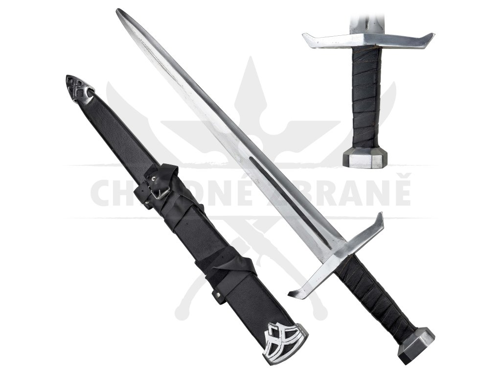 Masivní záštita o délce 20 cm, šestihranná hlavice a na rukojeti tvoří impozantní siluetu meče. Rukojeť je obalena černou kůží pro lepší úchop i styl. Výrazný středový výbrus a celkové zpracování dělají z tohoto meče perfektní kousek pro každého bojovníka.