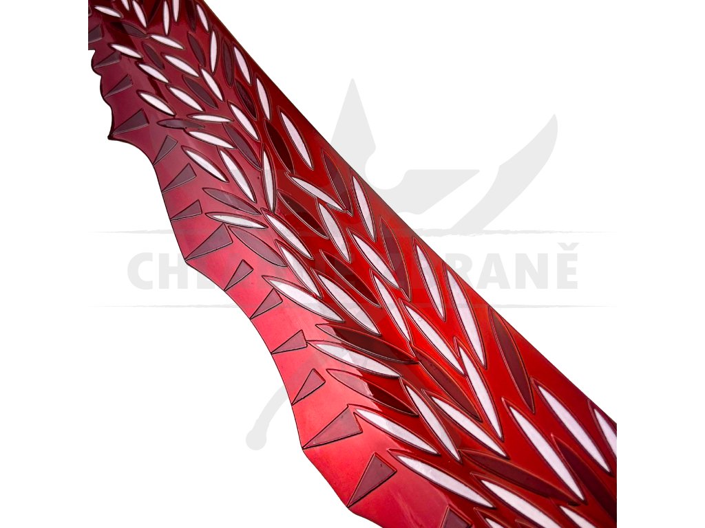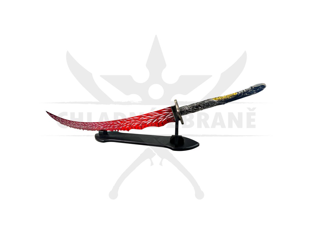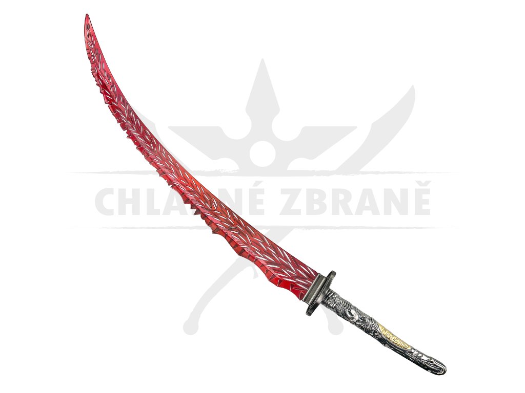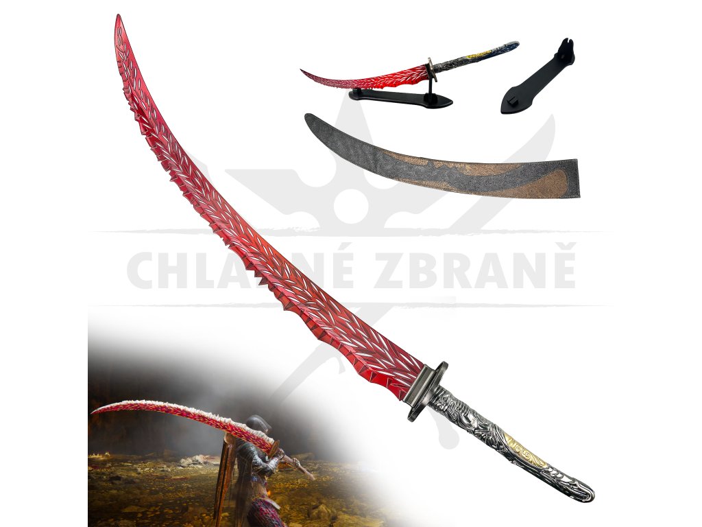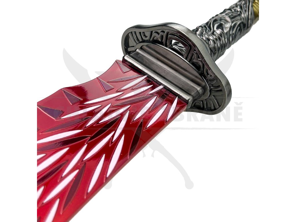 Velká „Dragon-Hunter’s Great Katana“ vyniká výrazným zakřivením, rudým motivem připomínajícím dračí šupiny a designem inspirovaným energickými útoky Bloodflame z Elden Ringu. Čepel z nerezové oceli s agresivními liniemi působí dynamicky, zatímco kovová záštita, rukojeť a hlavice dodávají meči robustní vzhled. Barevné prvky na rukojeti zvyšují vizuální kontrast a podporují fantasy estetiku známou z bossfightů.