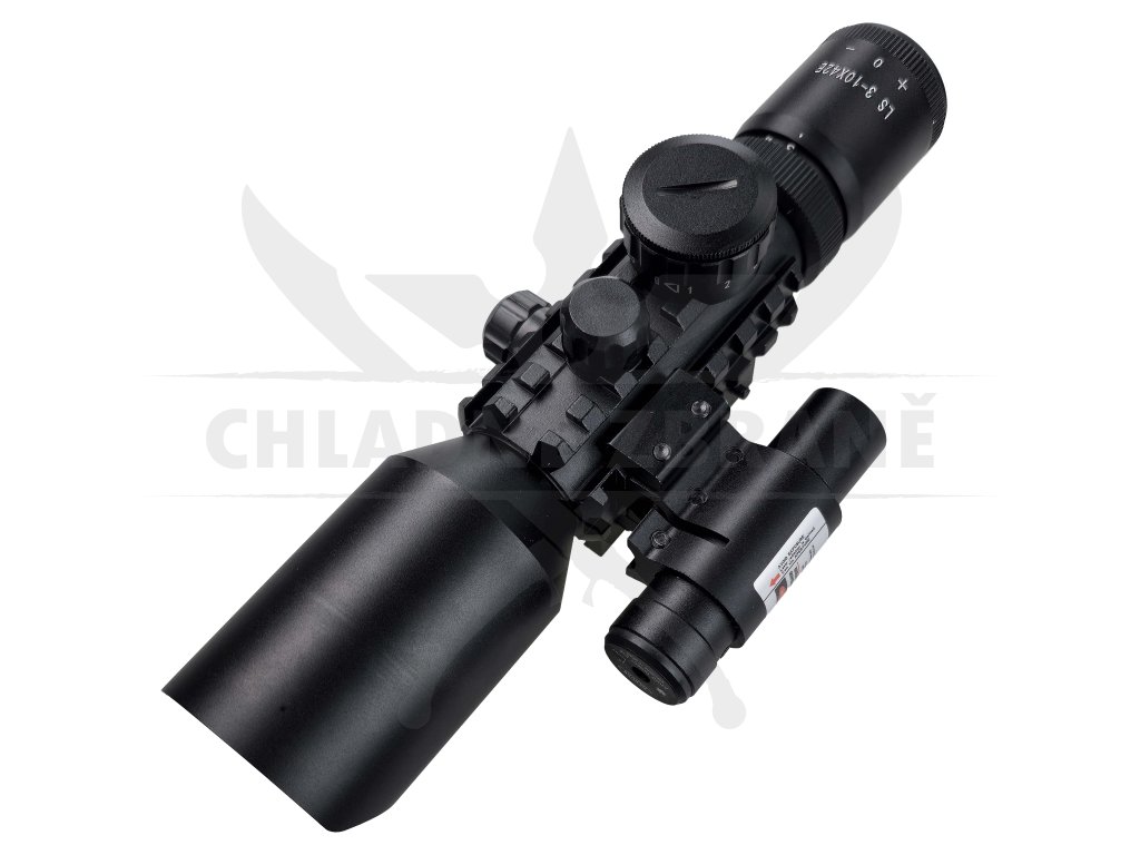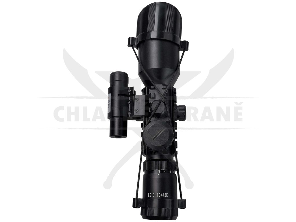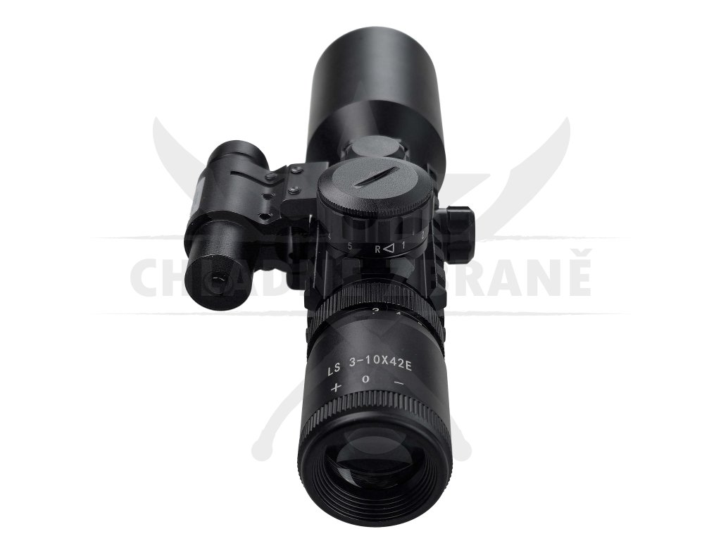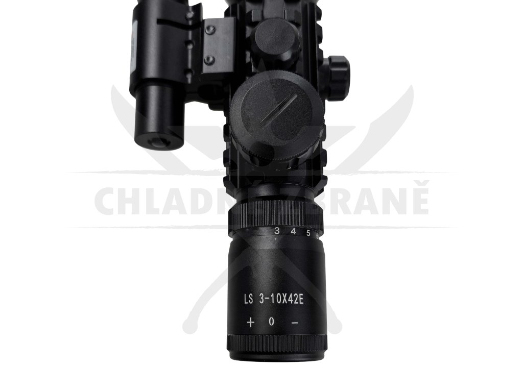 Kvalitně zpracovaná celokovová optika s přiblížením 3x-10x 42 mm je ideální volbou pro cíle na krátkou, až střední vzdálenost (50-150 metrů). Optika se dá umístit na lištu 11 mm a 22mm. Na boční straně optiky se nachází laser, který lze seřídit pomocí imbusu, který je v balení. Samotný puškohled se seřizuje rukou, otočnými mincemi pod krytkami.