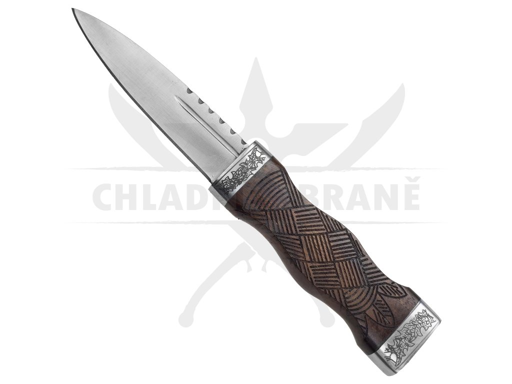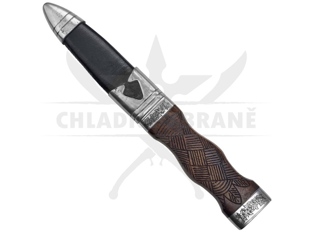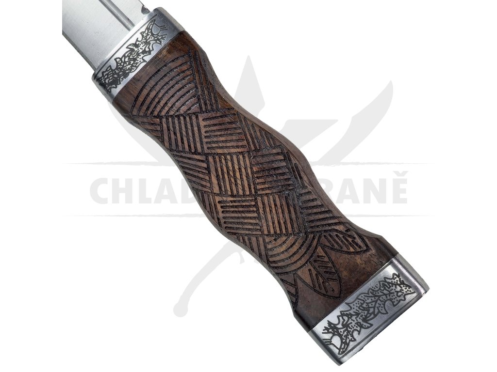 Rukojeť ze dřeva je precizně tvarovaná a doplněná o rytý ergonomický motiv, které jí dodávají osobitý charakter. Ocelové kování na záštitě a zakončení rukojeti zdobí jemné rytiny a zvyšují celkovou robustnost konstrukce.