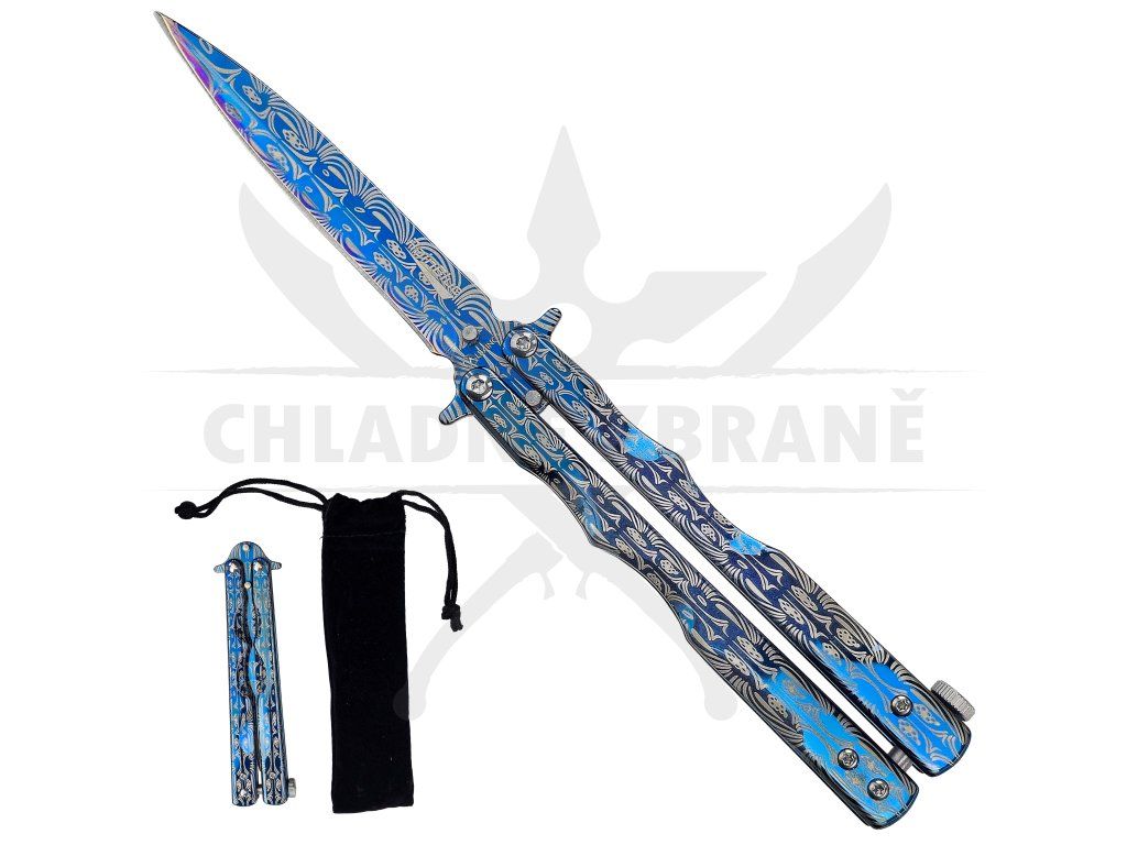 Stylový balisong v modrém designu zaujme na první pohled detailním zdobením po celé délce čepele i rukojeti. Kombinace lesklého povrchu a ornamentálních vzorů dává noži výrazný, až přímo luxusní vzhled, který se odlišuje od běžných motýlků. Kompaktní rozměry z něj zároveň dělají praktický nástroj, který se dobře vejde do kapsy nebo batohu.