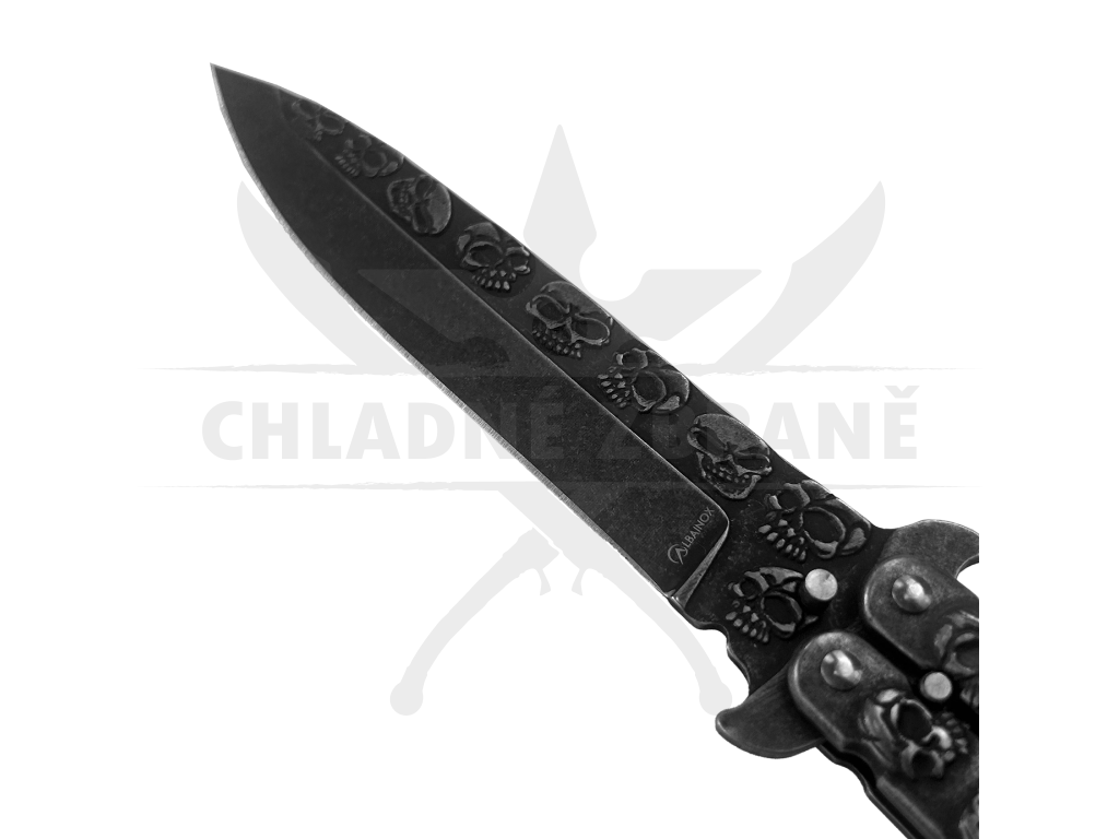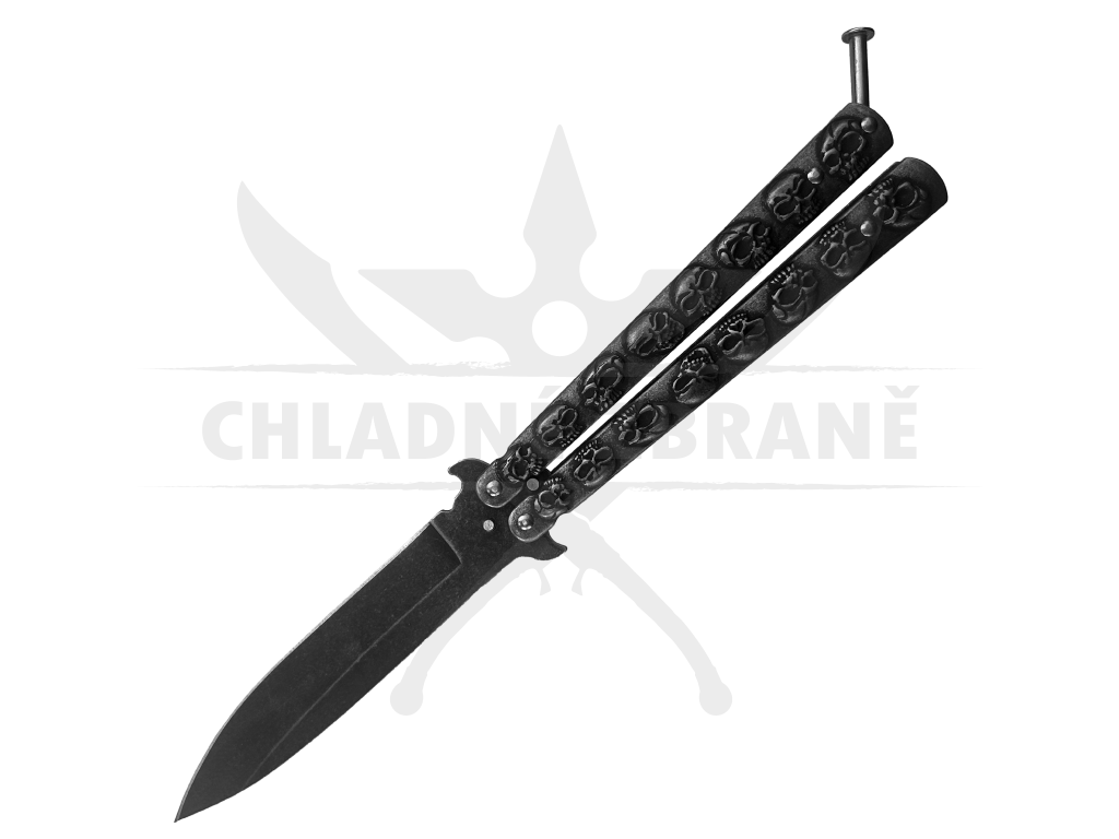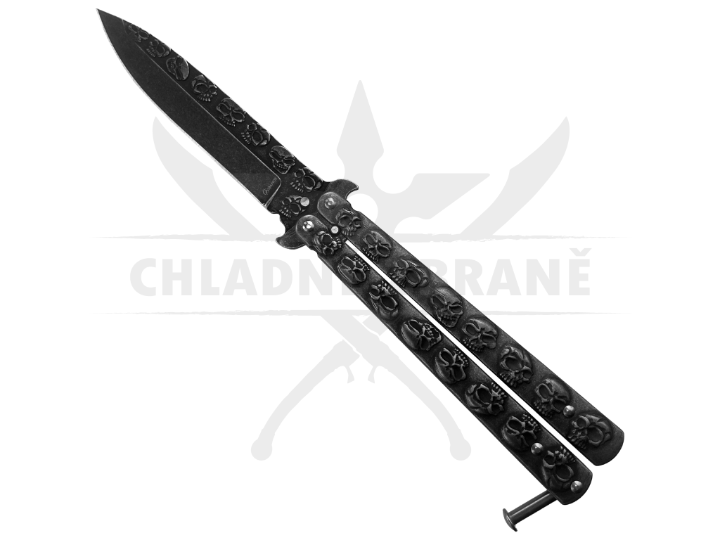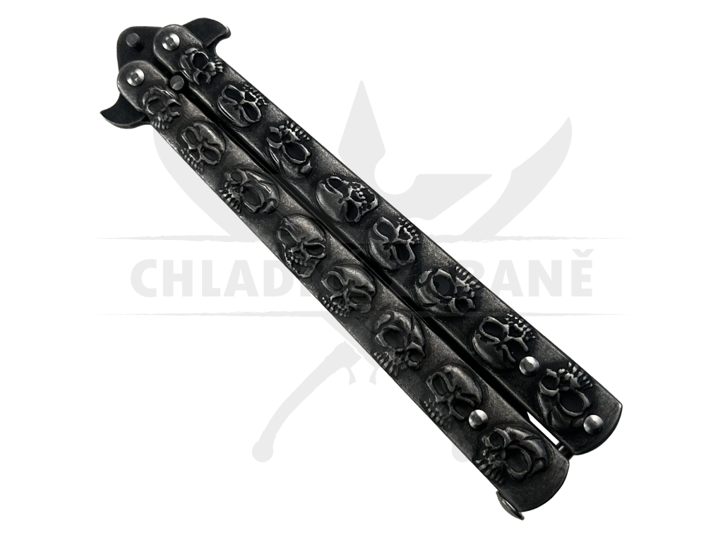 Černý balisong "SKULLERFLY" s čepelí z oceli 3Cr13Mov. Stylové a kompaktní provedení pro každodenní použití. Délka 23,3 cm.