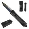Čelně vystřelovací nůž (OTF) s klipem na opasek a hrotem na sklo. Ultralight provedení (75 g). Imitace karbonu. 9 cm čepel z nerezové oceli 2cr13.