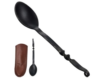 Ručně kovaná lžíce s elegantní spirálovou rukojetí a koženým pouzdrem. Odolný, funkční a stylový doplněk pro bushcraft i historické stolování.
