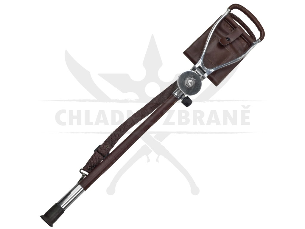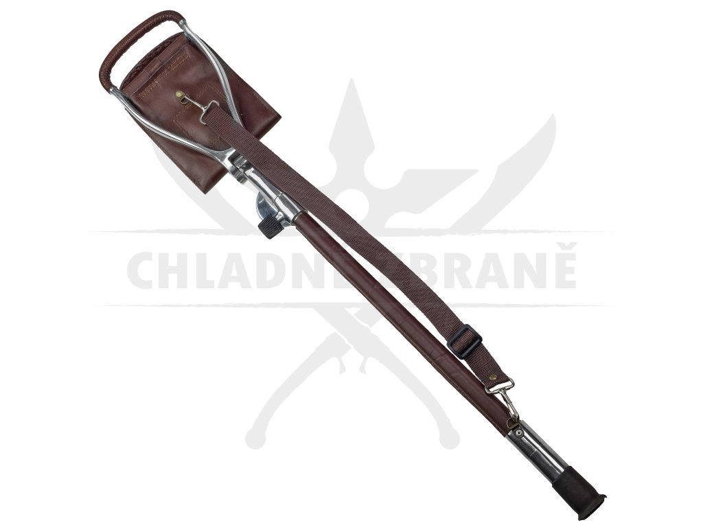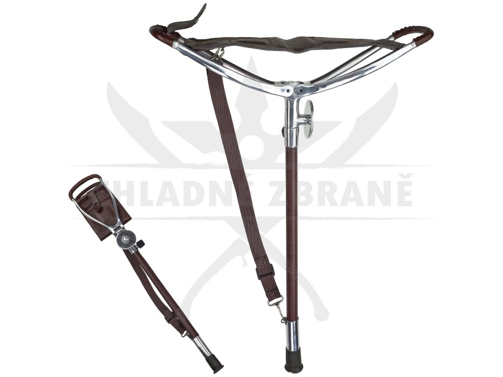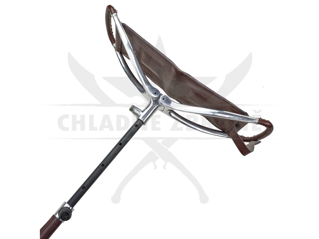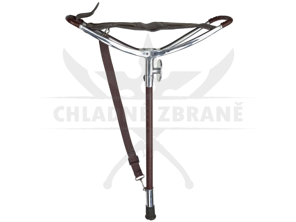 Výška je nastavitelná až do 80 cm, což umožňuje přizpůsobení různým situacím. Gumová nožička je odšroubovatelná– po jejím sejmutí je vidět ocelový hrot, na který lze našroubovat zajišťovací kolečko a pohodlně stoličku zapíchnout do měkčího terénu. Integrovaný popruh přes rameno pak zajišťuje snadné nošení v terénu.