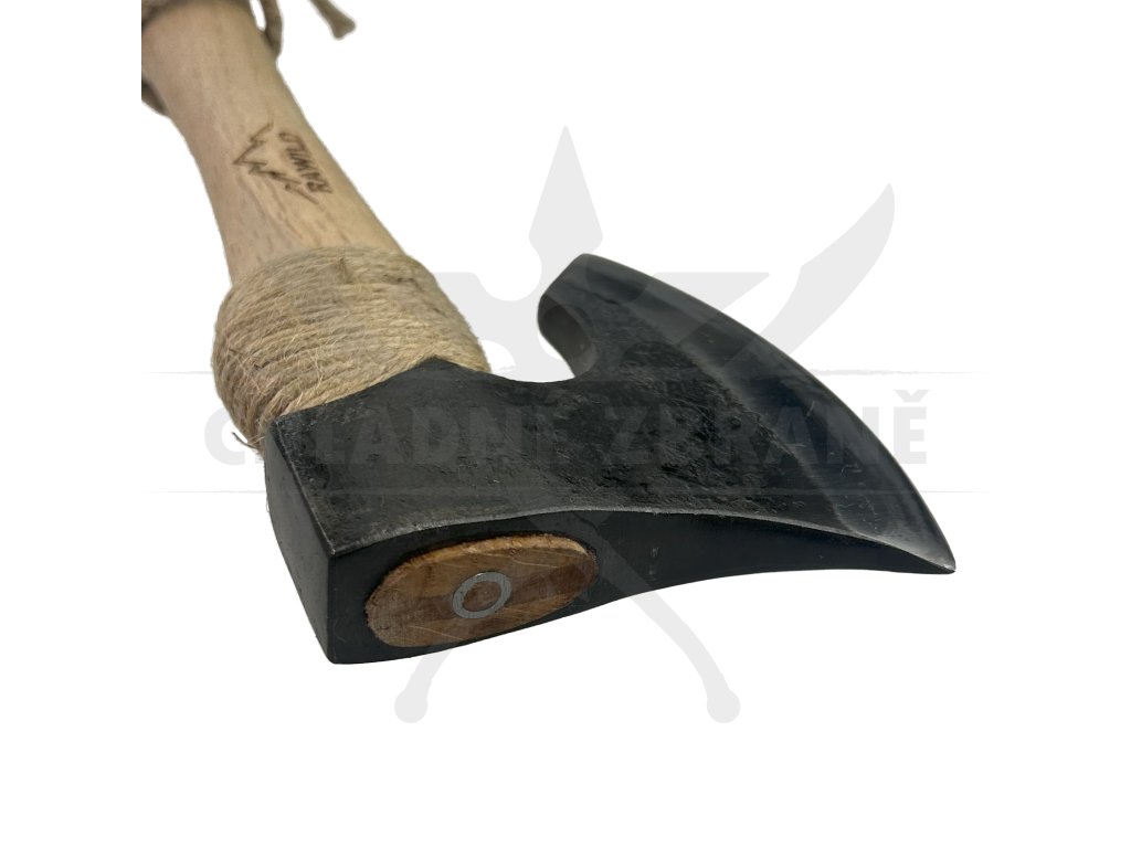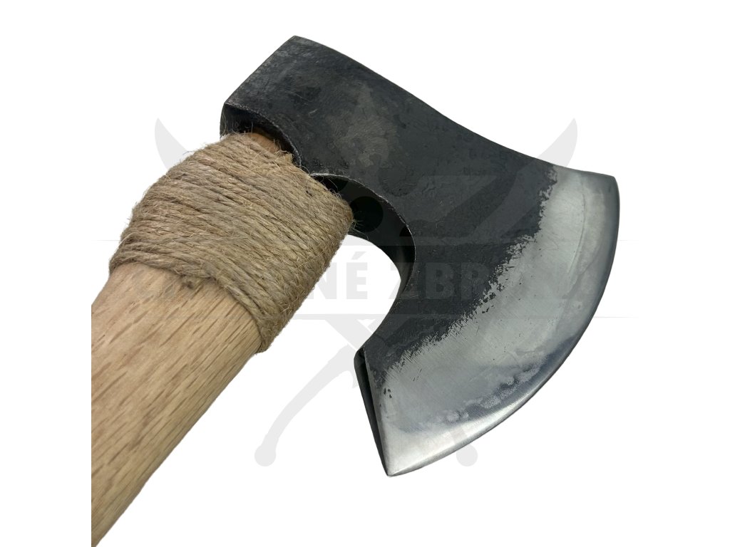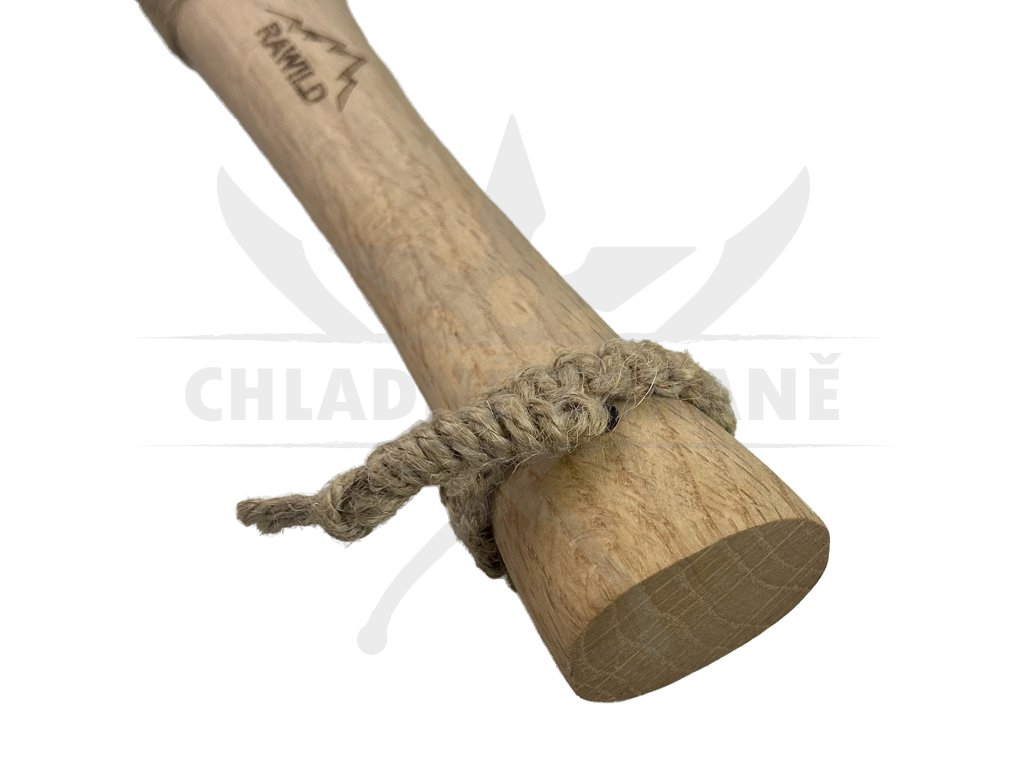 Rukojeť z bukového dřeva má nepravidelnou šířku 3 až 5 cm, což napomáhá pevnému a přirozenému úchopu. Díky celkové délce 38 cm nabízí ideální poměr mezi kontrolou a silou úderu. Stylový provazový oplet navíc zvyšuje jistotu při držení a dodává sekyrce jedinečný vzhled.