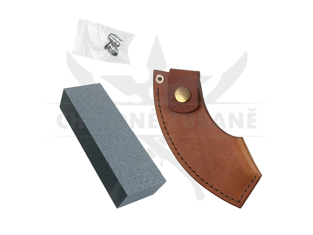 Součástí balení je ochranné pouzdro, praktický brousek pro údržbu ostří a náhradní klínky pro zajištění hlavice při dlouhodobém používání.