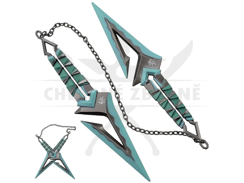 Oba kunaie jsou neostřené a vyrobené ze slitiny zinku, zatímco spojovací řetízek je z nerezové oceli. Kovové provedení pomáhá vyniknout tvarům, výřezům i barevným detailům a zároveň dává celku příjemnou váhu v ruce. Řetízek oba kusy propojuje a dodává celé sestavě osobitý vzhled, který dobře funguje při vystavení, zavěšení i jako součást tematické kolekce.