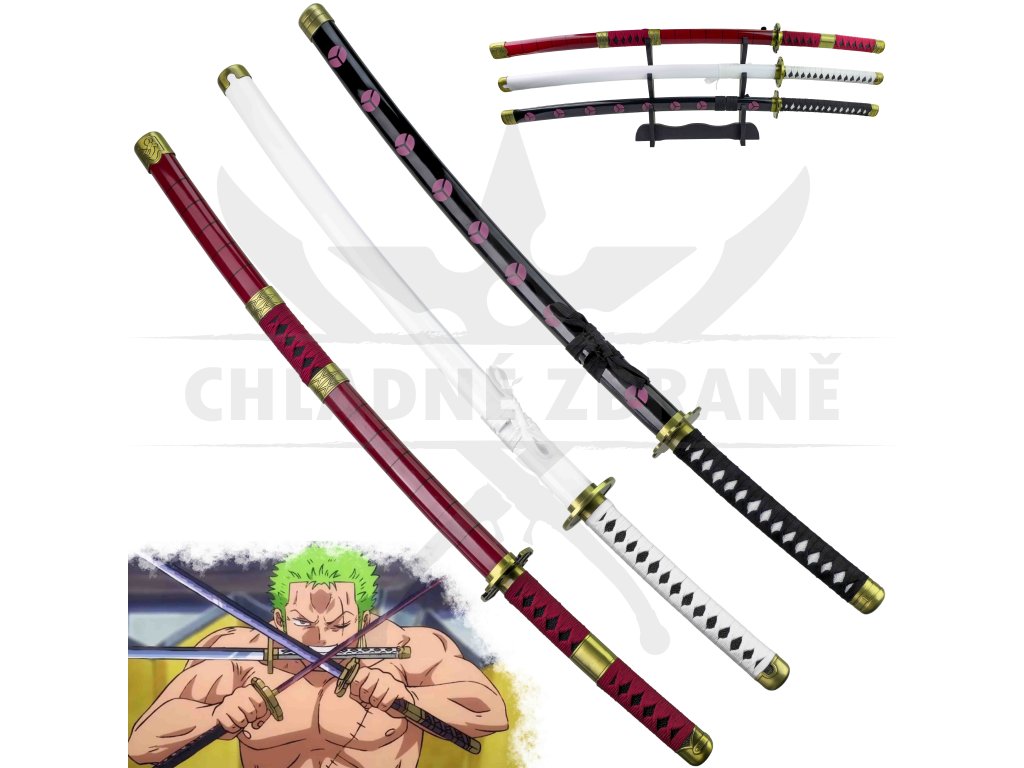 Roronoa Zoro, nejslavnější šermíř světa One Piece, je známý svým unikátním stylem boje „Santoryu“ – tedy stylem tří mečů, kde používá jeden meč v každé ruce a třetí drží v ústech. Tato sada obsahuje věrné repliky jeho tří ikonických katan: Wado Ichimonji (bílá katana), Sandai Kitetsu (červená katana) a Shusui (černá katana se světle fialovým zdobením). Každá z těchto zbraní má svůj příběh, význam i charakter, což z této sady dělá jedinečný sběratelský kousek pro každého fanouška One Piece, nebo sběratele.