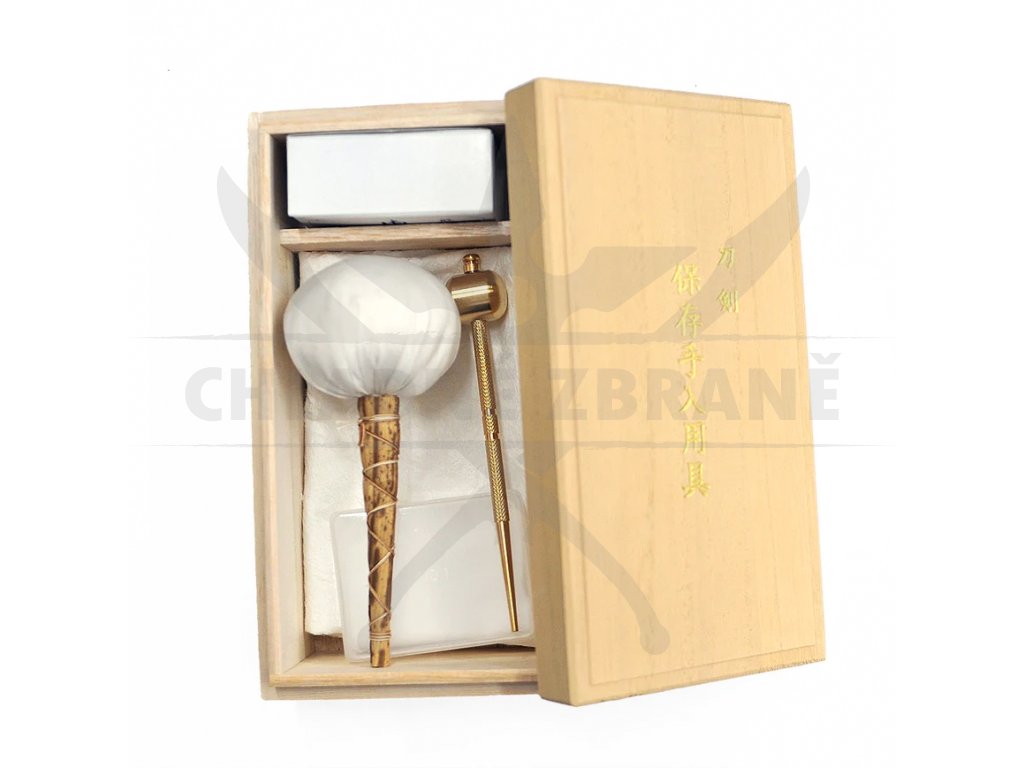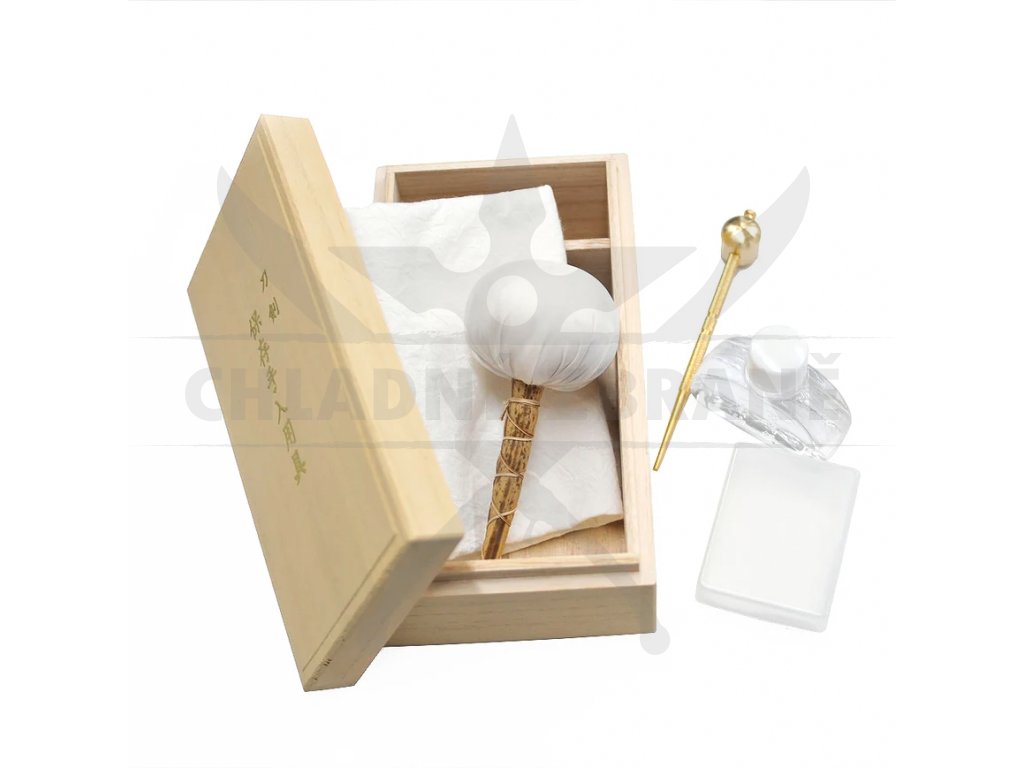 Uvnitř sady se nachází větší prémiové balení prášku uchiko, nástroj mekuginuki, papír nuguigami, kvalitní olej na meče a flanelové pouzdro pro uložení příslušenství. Jednotlivé prvky odpovídají běžným potřebám při čištění a konzervaci čepele, kdy je důležité odstranit nečistoty, starý olej a následně povrch znovu ošetřit. Celý set je uložen v krabičce ze dřeva paulownie, která působí elegantně a zároveň dobře odpovídá charakteru tradiční japonské údržbové výbavy.