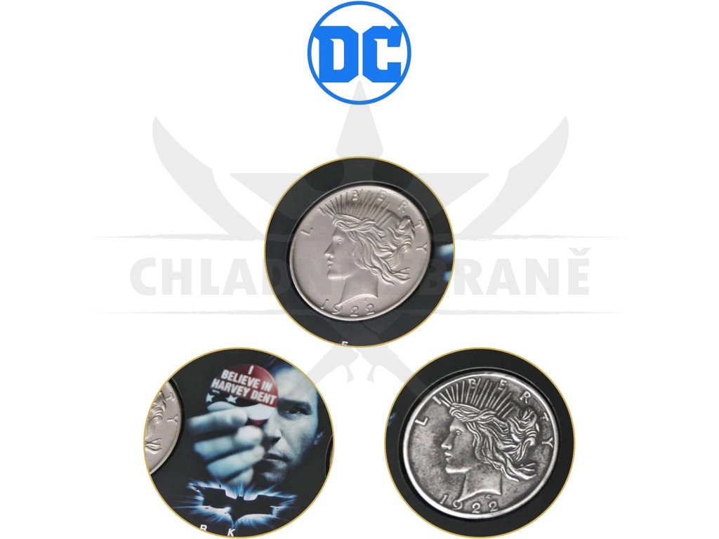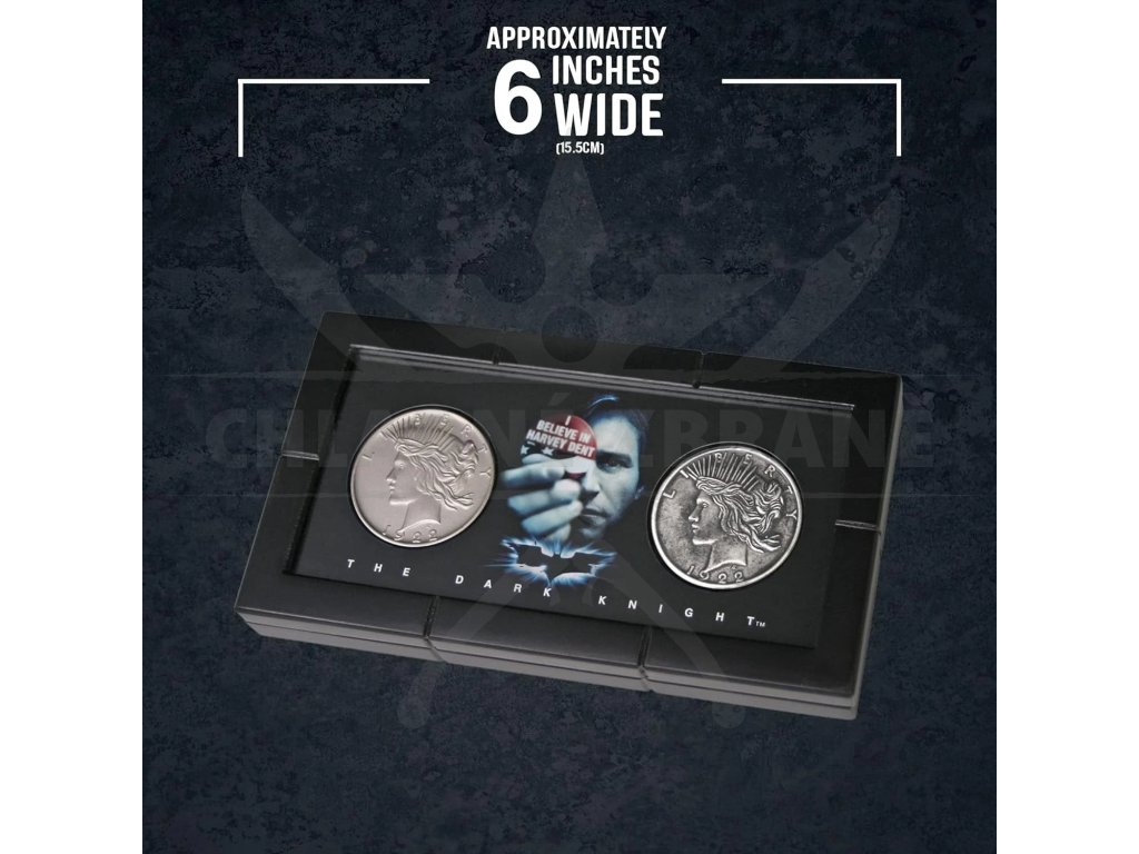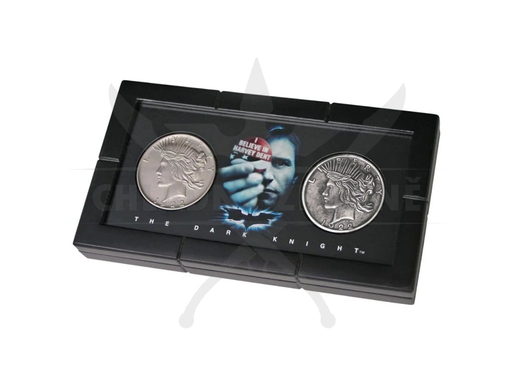 Tyto dvě sběratelské, stříbrem pokovené mince s motivem dvou hlav jsou uloženy v elegantní černé prezentační kazetě. Ve filmu The Dark Knight (Temný rytíř) používá Harvey Dent svou ikonickou dvoustrannou minci k rozhodování o osudu – zda zvítězí dobro, nebo zlo. Právě tento symbol náhody a duality z ní udělal jeden z nejvíce ikonických předmětů celé trilogie.