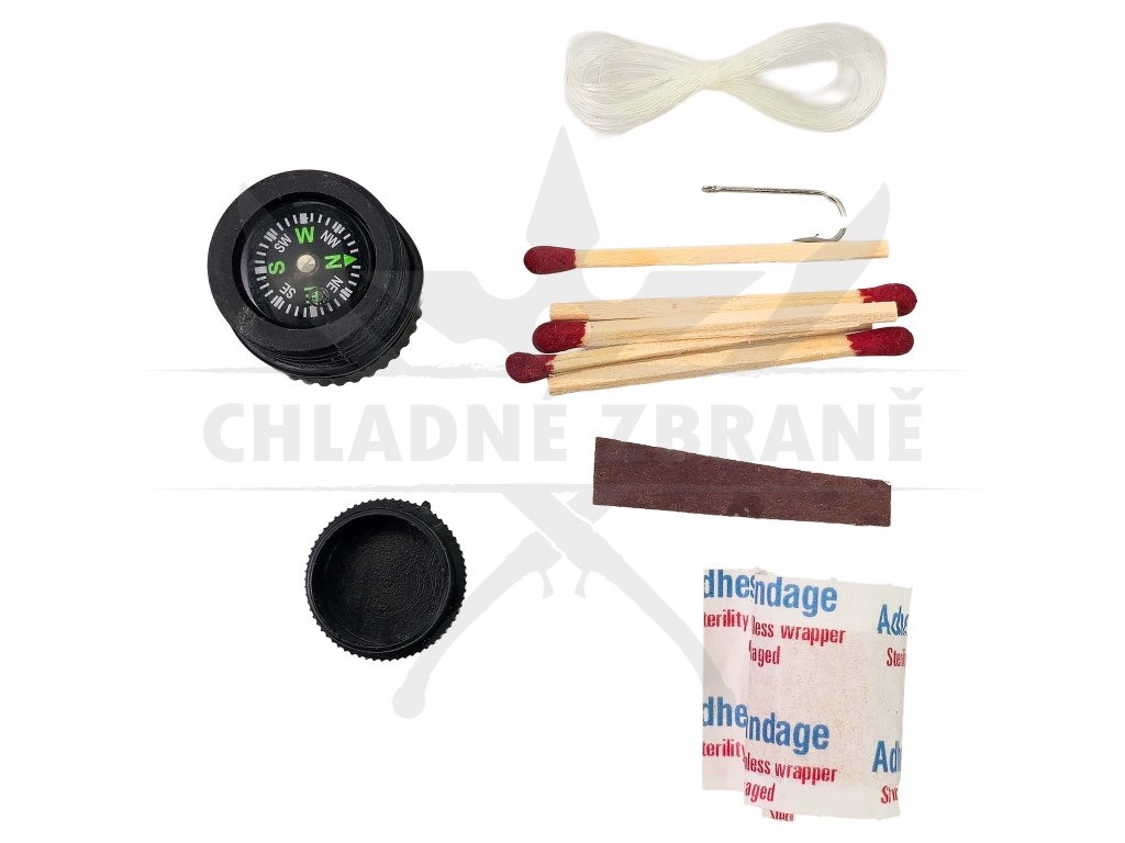 To vše je ukryto ve voděodolném pouzdře. Samozřejmě ve fantazii se meze nekladou a do rukojeti můžete umístit věci dle Vašeho uvážení - např. papírové peníze, sirky apod.